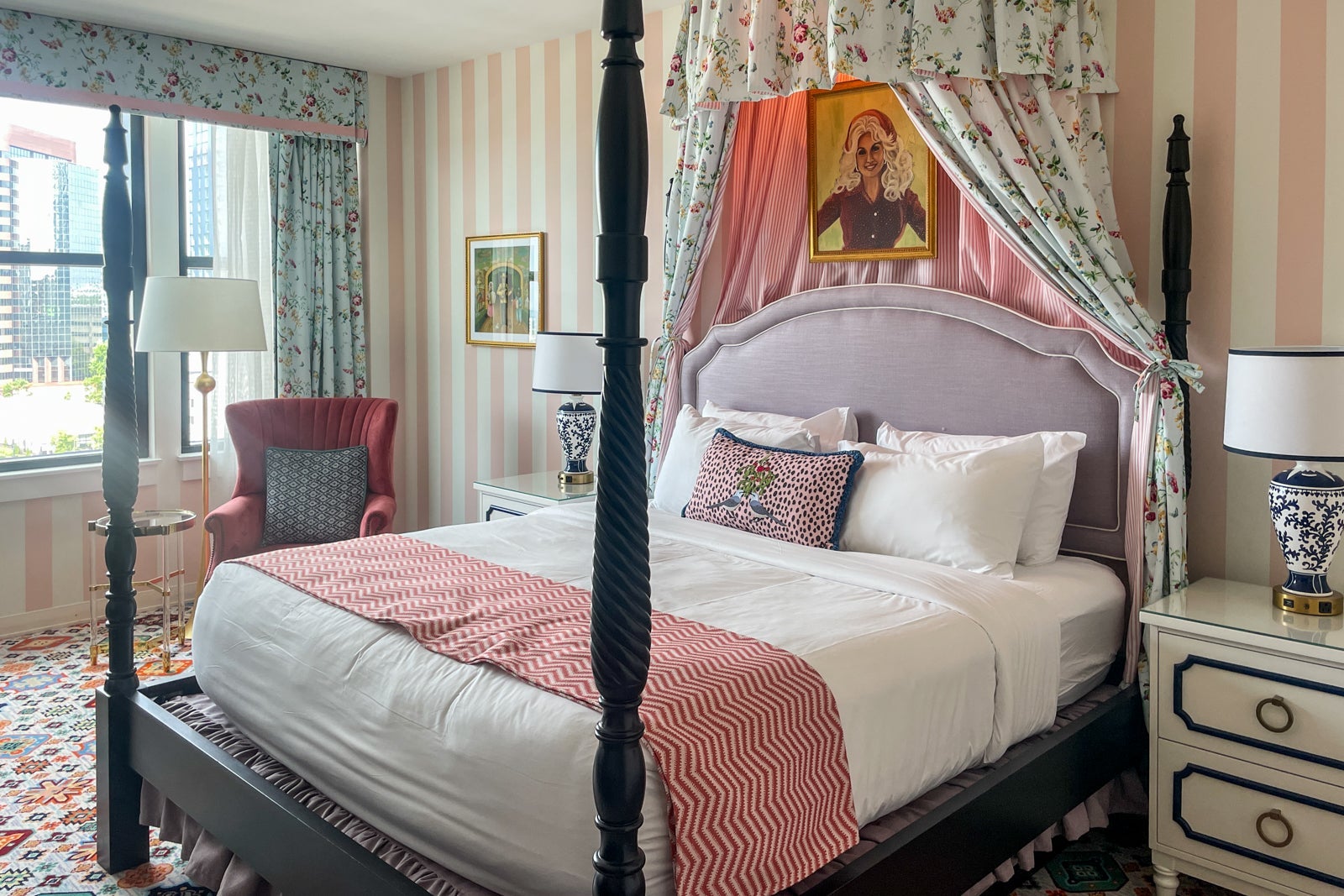 Located near Vanderbilt University, this Graduate has some subtle nods to the prestigious school — but really, it's an over-the-top, pink-hued ode to some of the leading ladies of country music. Upon walking in, you're greeted by a hooked-rug portrait of Grand Ole Opry star Minnie Pearl. On the roof, a bust of Dolly Parton is the centerpiece of White Limozeene, a dainty bar popular with bachelorette parties. And in the country-chic rooms, one of the most famous photos of Dolly hangs over the bed, so you know you can go to sleep protected by an angel.