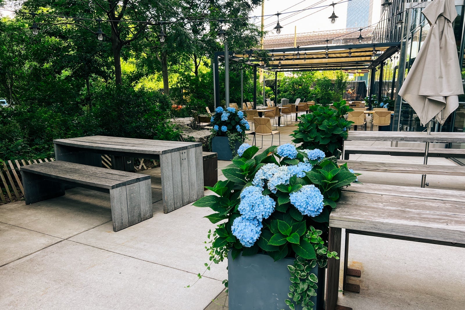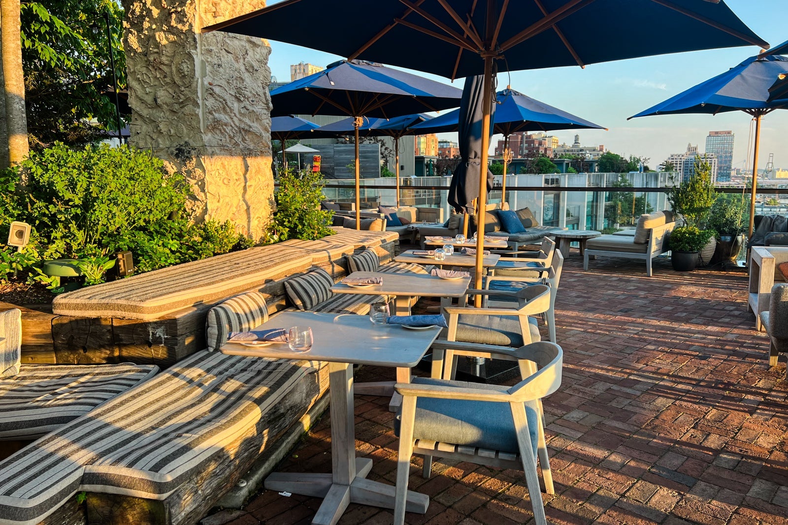 On the 10th floor of 1 Hotel Brooklyn Bridge, guests will find both Harriet's Lounge and Harriet's Rooftop. These are right next to each other, but also are distinct in what they offer. Harriet's Rooftop is the slightly more casual spot that's open from 11 a.m. to midnight, where you order at the bar, and it's on you to find a good place to stand or sit.