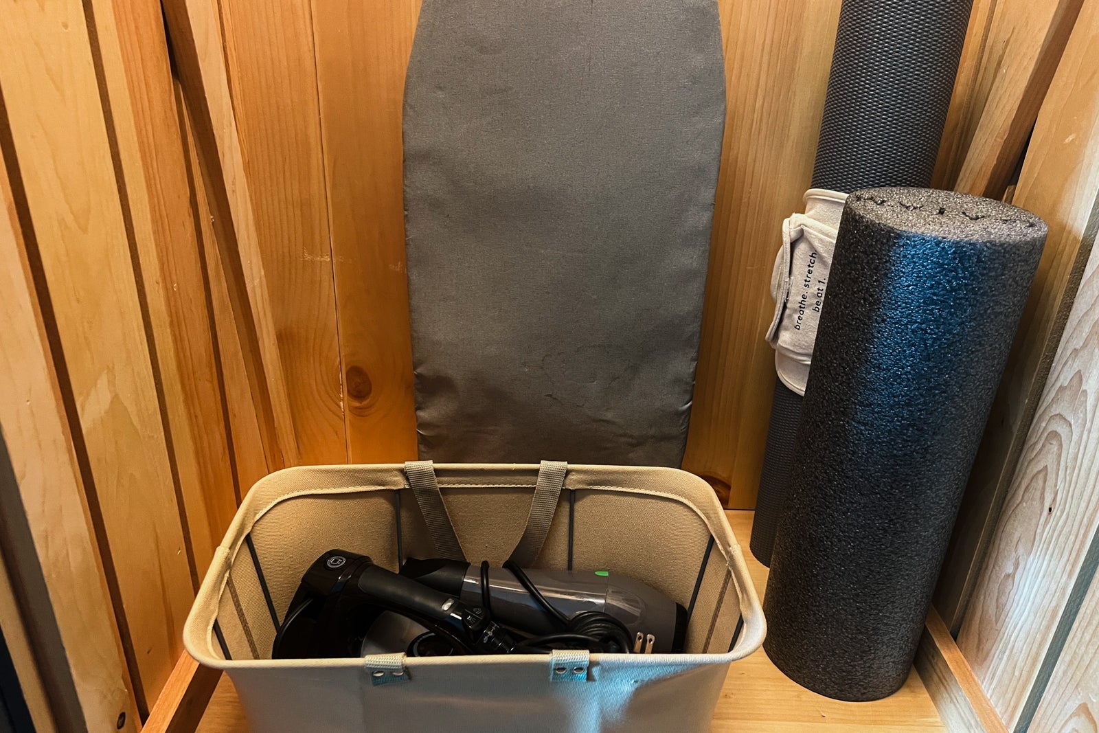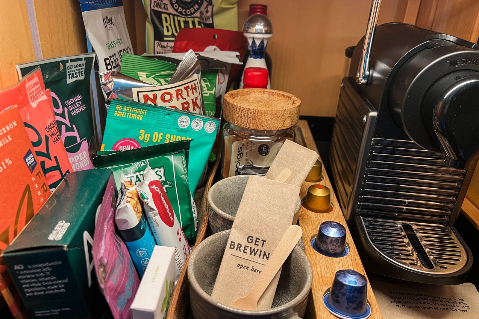 Speaking of eating, 1 Hotels are known for some fun, high-quality and locally sourced goodies in the minibar, and this was no exception. While we didn't indulge, it was fun to see options like beer from Brooklyn Brewery and chips from the North Fork of Long Island. There was also a Nespresso coffee machine, while in the closet area, we found a yoga mat and cotton knit robes.