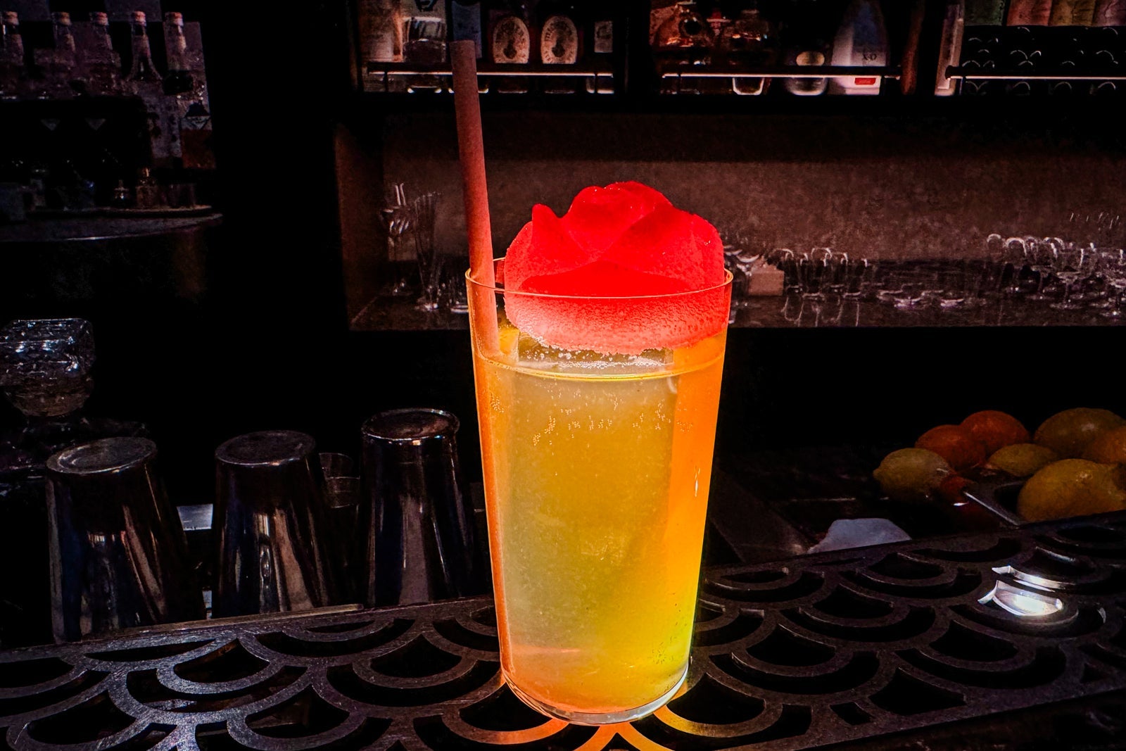 Topped by a rose-shaped ice cube fashioned from cranberry and ginger, La Belle et la Bete (Beauty and the Beast) is a heady concoction of Hoji tea-infused vodka and liqueur with aromatic bitters and ginger beer ($22). The Smoked Ume Fashioned mixes Michter's bourbon, Japanese whiskey and sour plum-infused brandy to provide some bite, finished with mellow smoked hinoki bitters and then smoked with cherry wood before a garnish of sour plum, cherry and orange peel ($23).