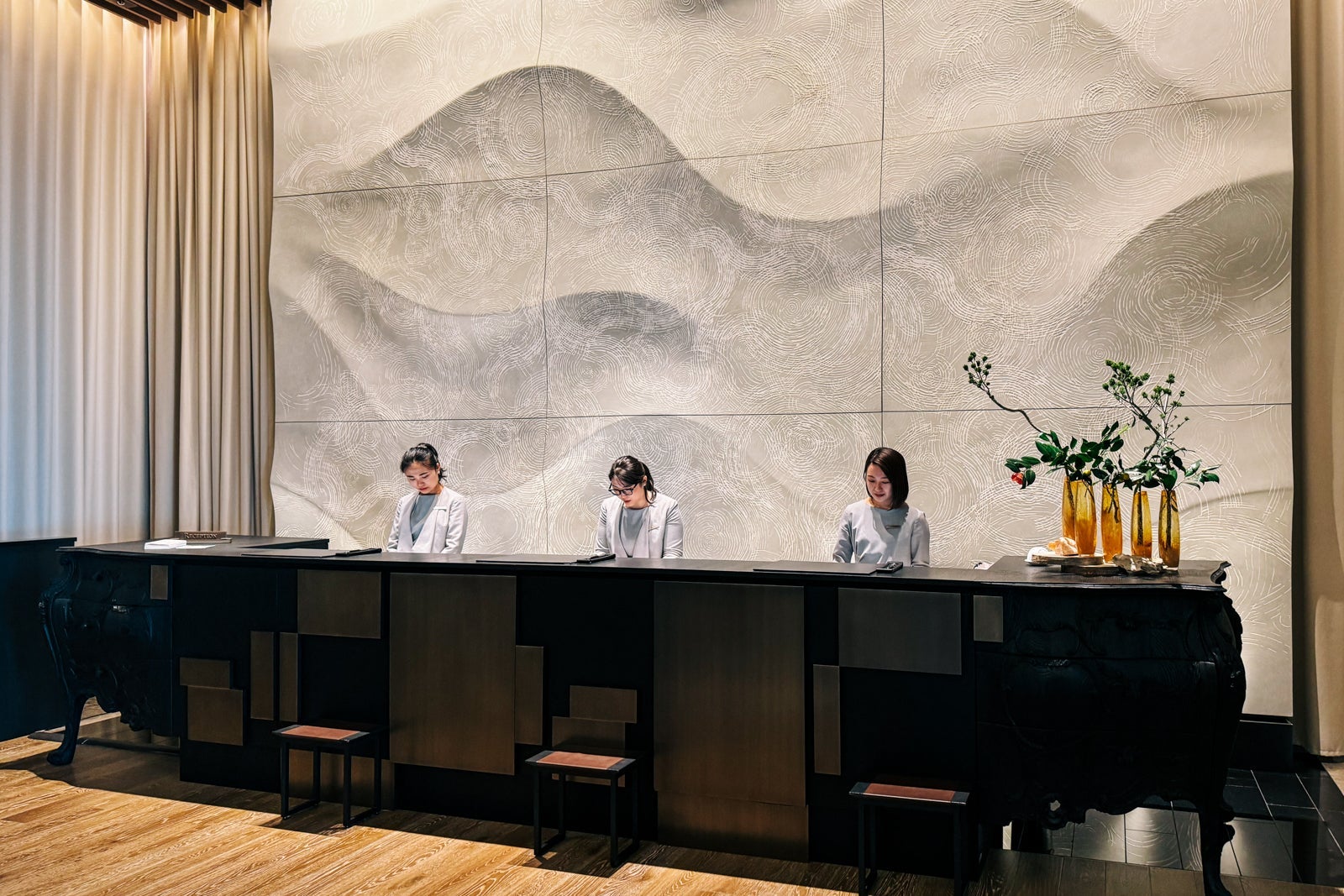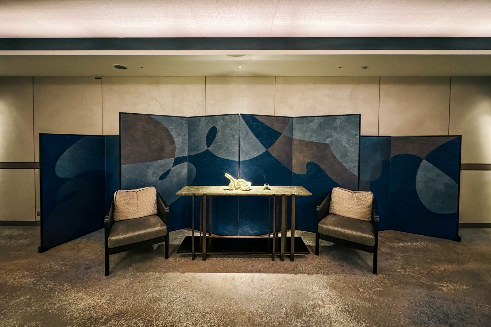Don't forget to look up from the reception desk to admire the sun-inspired cupola, whose interior is decorated with the Japanese characters for the seasons created in free-form calligraphy by artist Nobuko Kawahara. Just below, an artful floral display based on the traditional Japanese art of flower arrangement creates a natural focal point for the space.