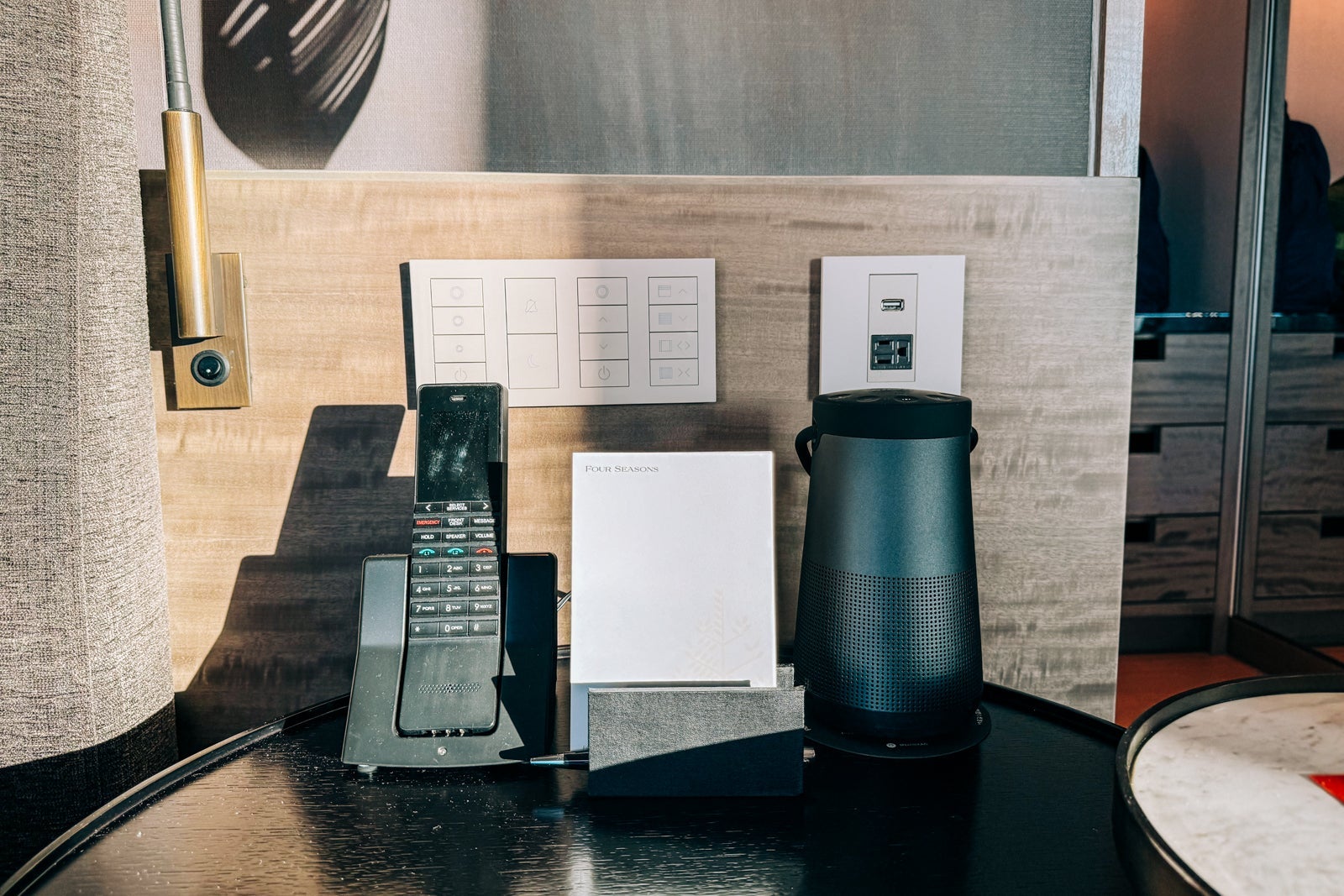 To either side was a panel of controls for the lights and curtains along with nightstands — a Bluetooth speaker and the phone on one side, and a tablet for taking advantage of the hotel's amenities on the other. The long, low table set against the windows held vases with flowers and a large flat-screen television.
