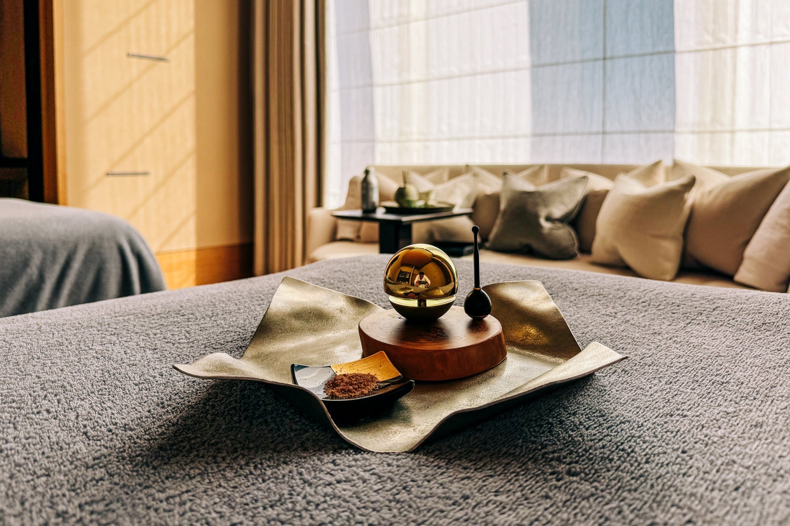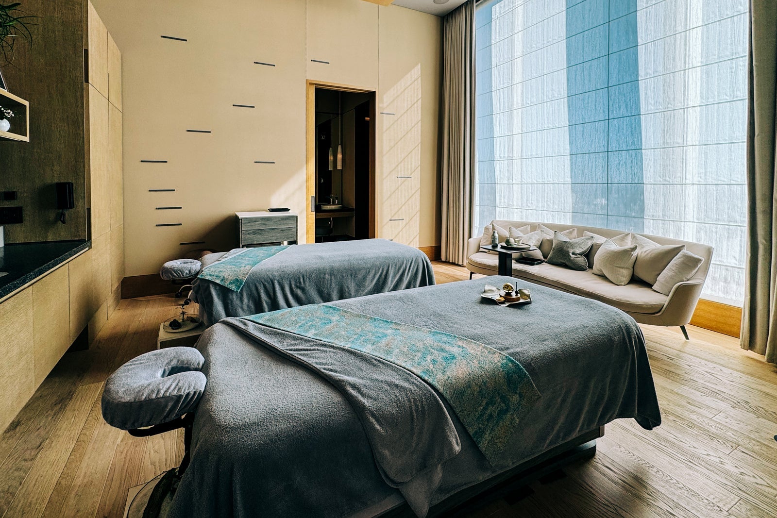 After you change into a robe and slippers in the locker room, your therapist will escort you to one of the five treatment rooms, which have blond wood flooring and paneling plus enormous windows so you can either have light streaming in or ask for the shades to be lowered for a more soporific setting. With the clang of a traditional round orin bell, your experience will commence.