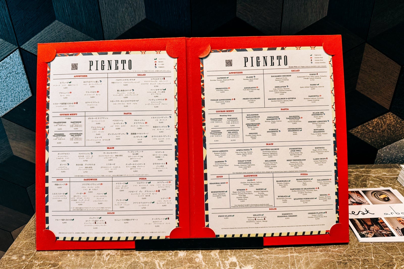 The Italian lunch and dinner menus provide familiar options like fried calamari with aioli ($25); linguine with prawns, zucchini and tomato ($31); and a variety of handmade pizzas ($19-$41); as well as desserts like homemade tiramisu ($15) and gelato ($14).