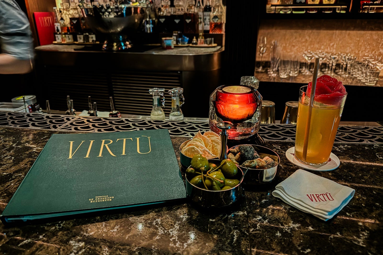 Virtu epitomizes a cosmopolitan hotel watering hole, with moody lighting, plenty of intimate booths and window seats, a lively bar with bottles stretching to the ceiling and a counter where the mixologists theatrically assemble libations inspired by both legends and fairy tales.