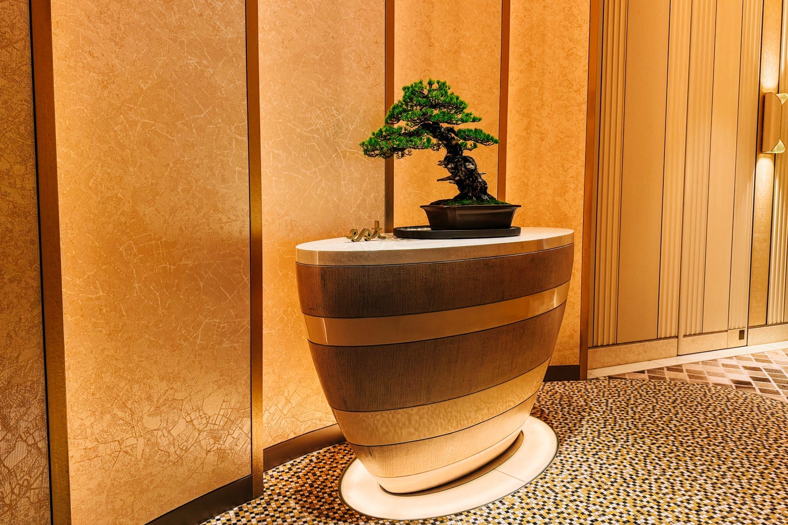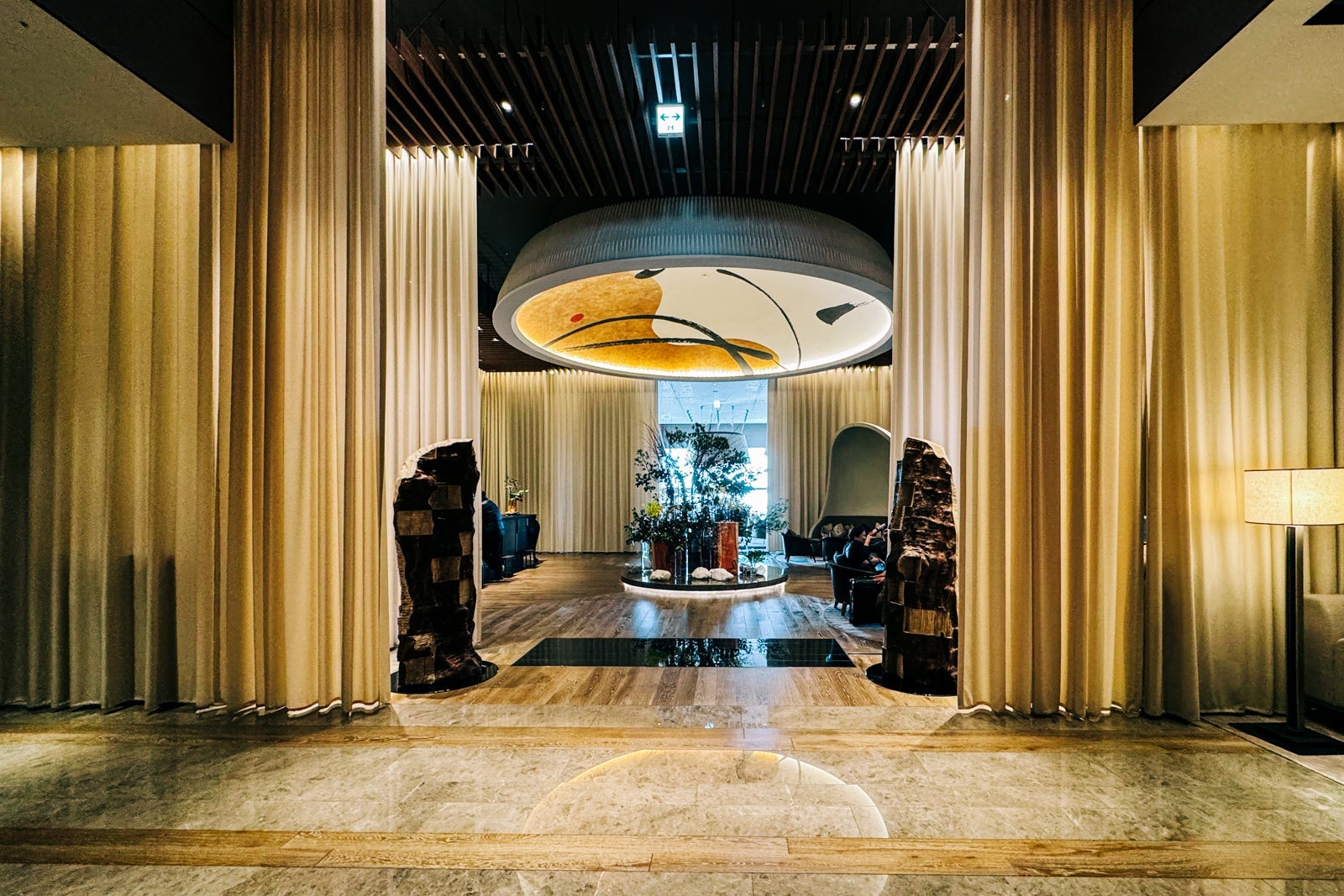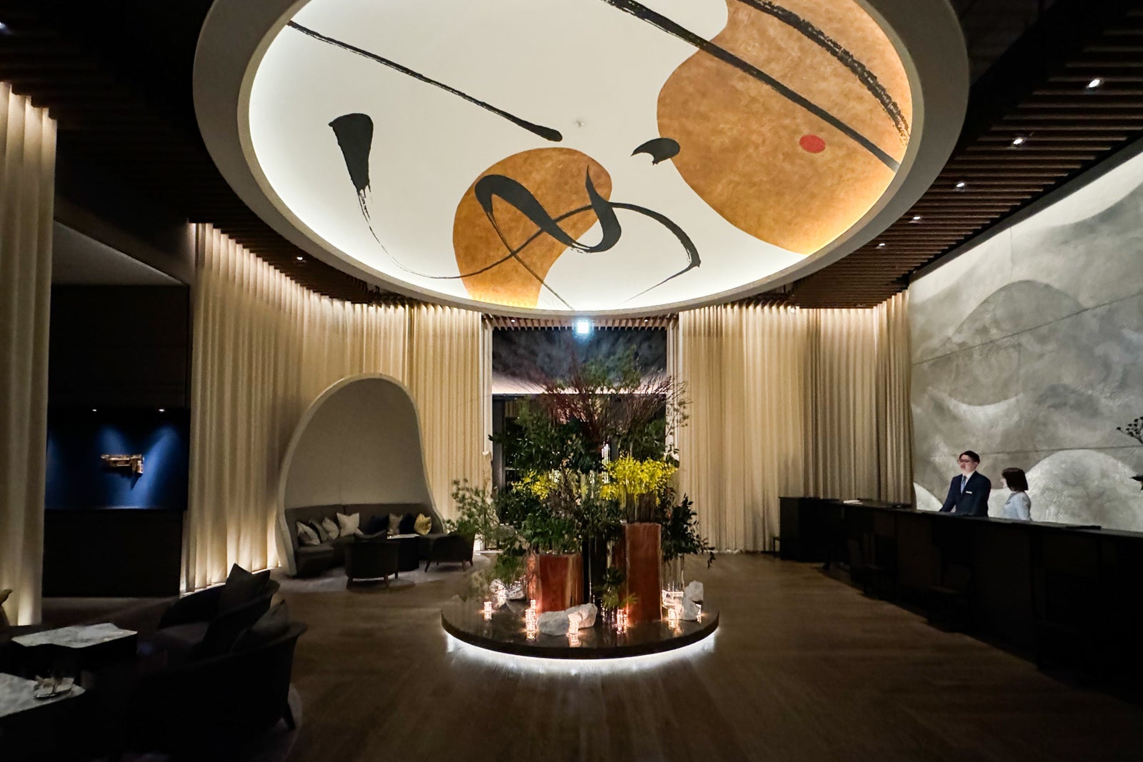 Don't forget to look up from the reception desk to admire the sun-inspired cupola, whose interior is decorated with the Japanese characters for the seasons created in free-form calligraphy by artist Nobuko Kawahara. Just below, an artful floral display based on the traditional Japanese art of flower arrangement creates a natural focal point for the space.