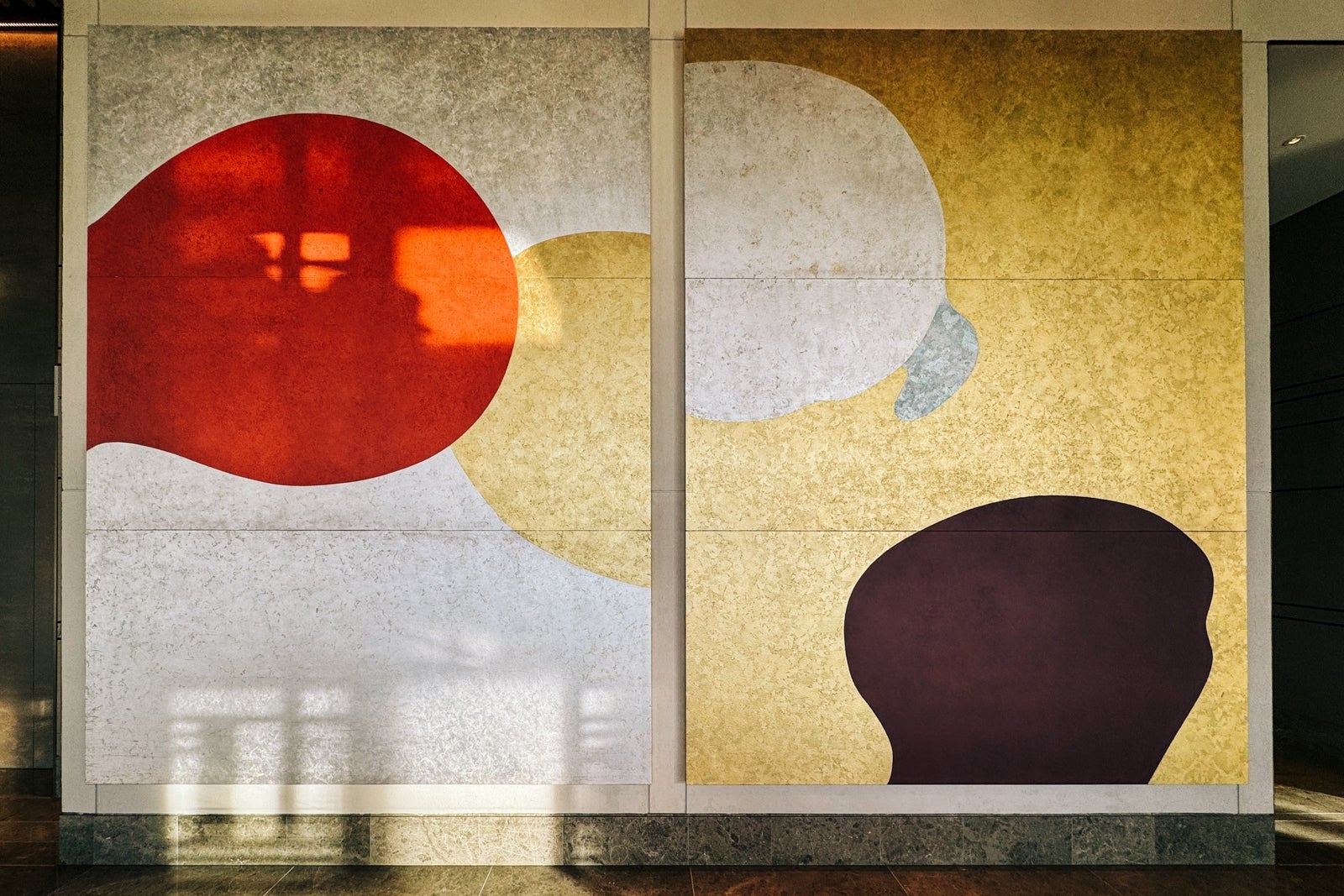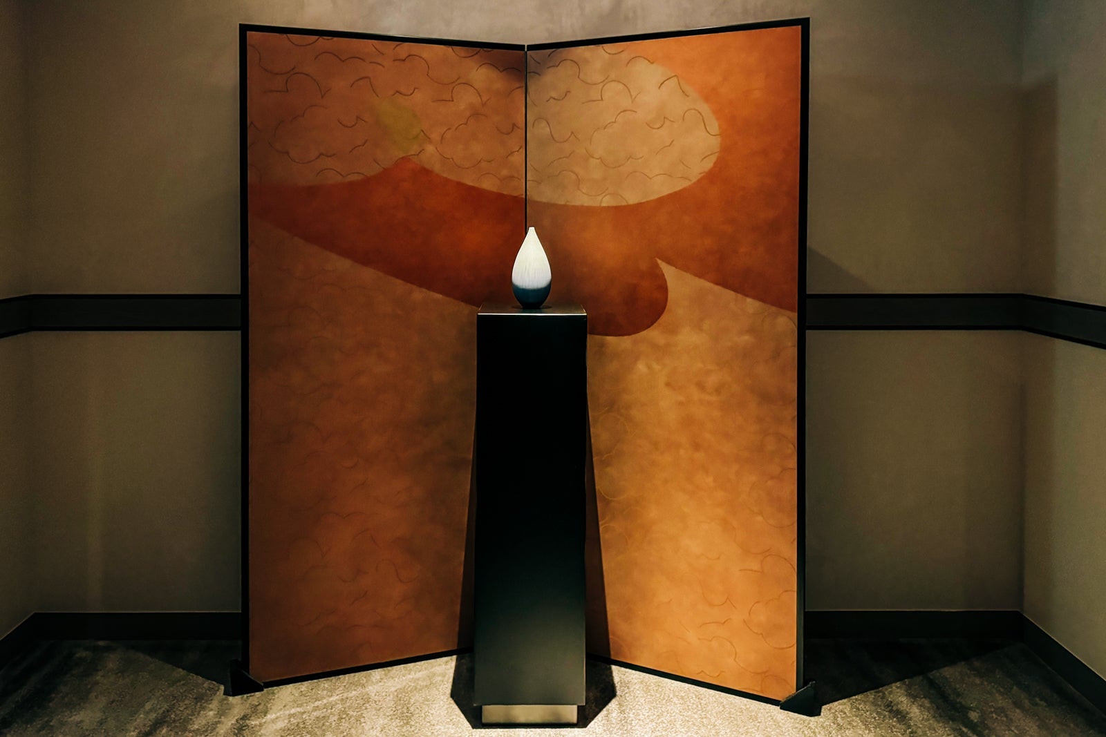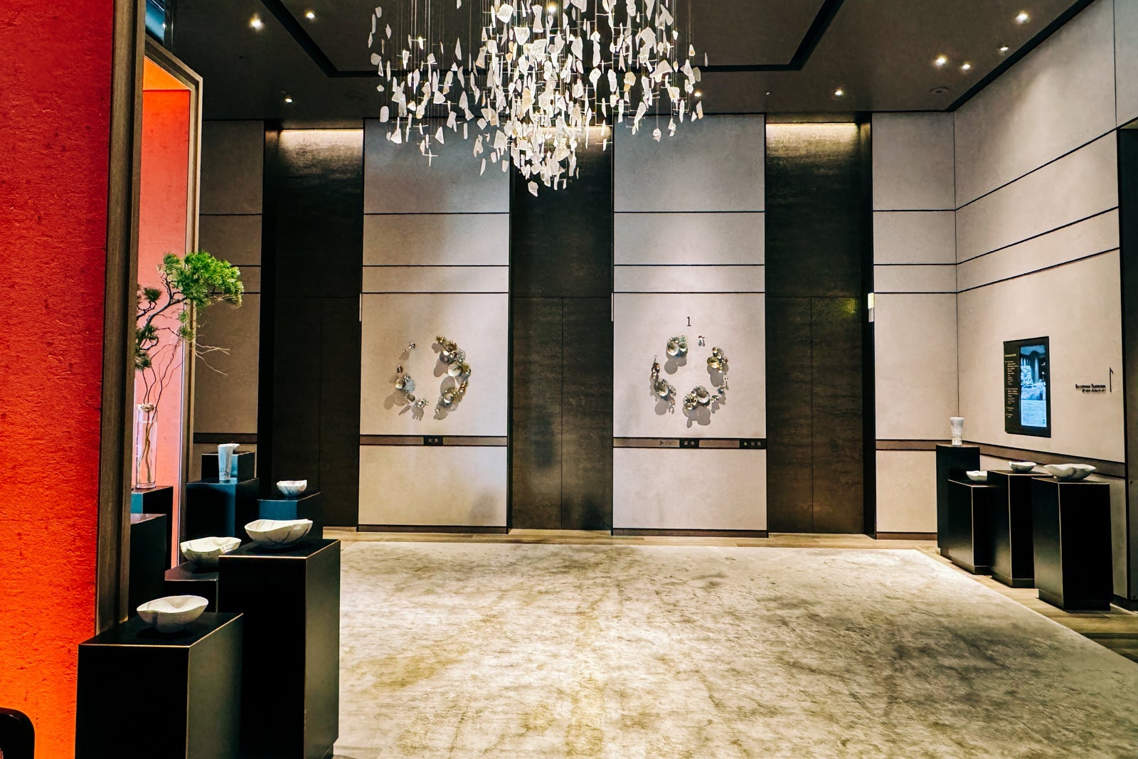 Don't forget to look up from the reception desk to admire the sun-inspired cupola, whose interior is decorated with the Japanese characters for the seasons created in free-form calligraphy by artist Nobuko Kawahara. Just below, an artful floral display based on the traditional Japanese art of flower arrangement creates a natural focal point for the space.