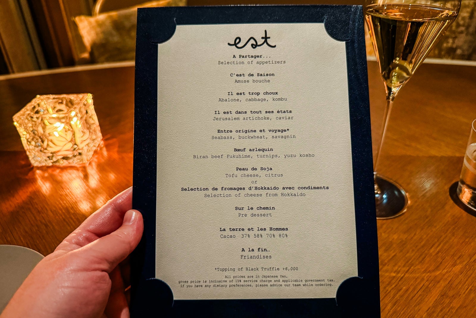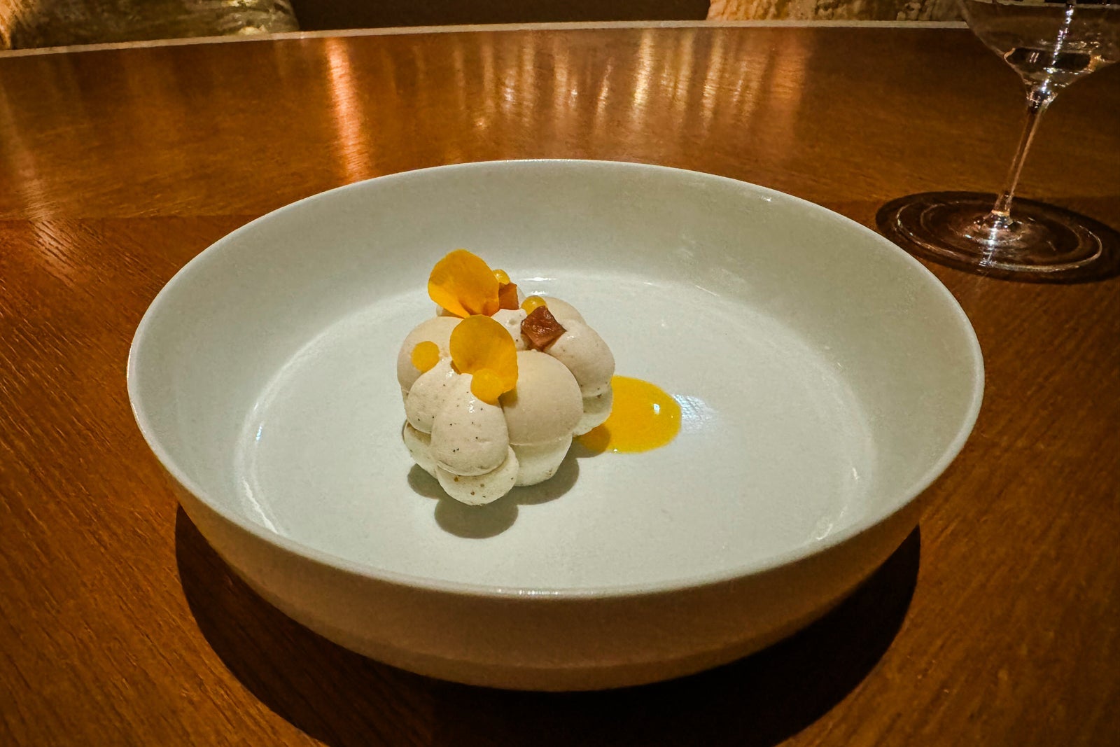 You're almost to the finish line, but not before sweet bites by pastry chef Michele Abbatemarco, like chestnut mousse and vanilla-bean ice cream with mizkan citrus gelee and a smattering of mignardises made with chocolates of varying provenance and cacao concentration.