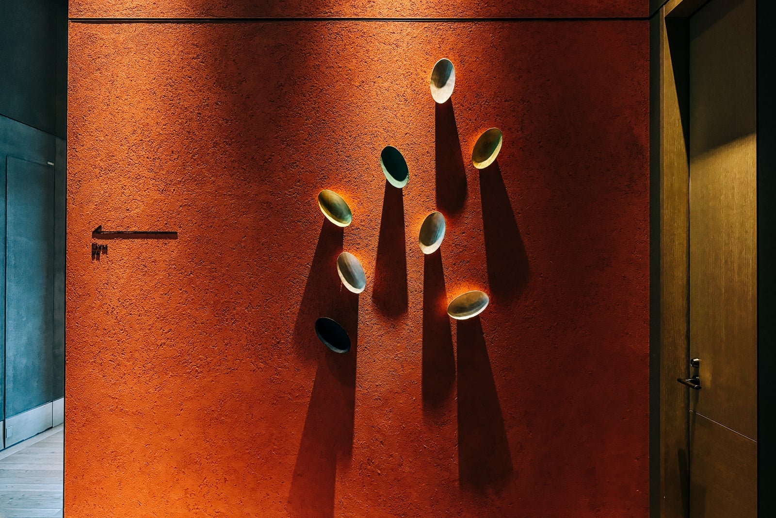 The living room comprised a pillow-populated couch and armchair along with a small table and chair that doubled as a workspace thanks to a console with plugs and outlets galore. The palette was mostly metal- and mineral-toned with accents of ochre, gold and lapis lazuli. Above it all, on the wall, fossil-like pieces of art were carefully affixed to evoke a sense of transient beauty.