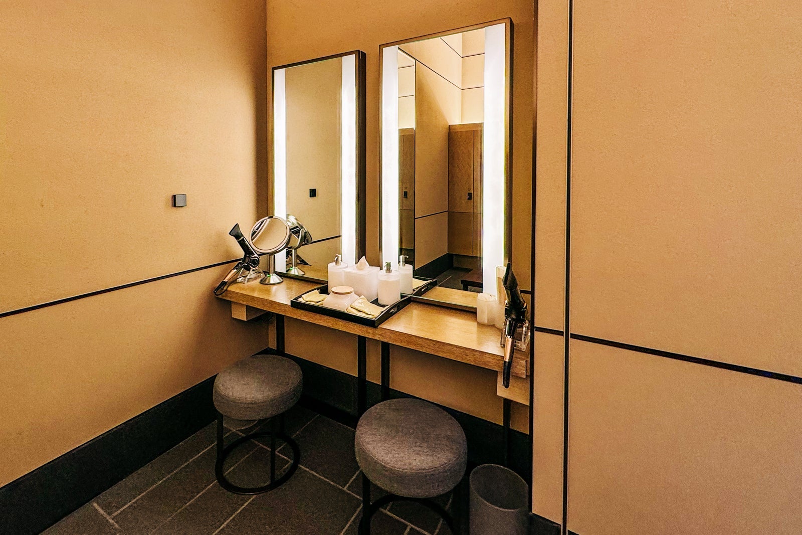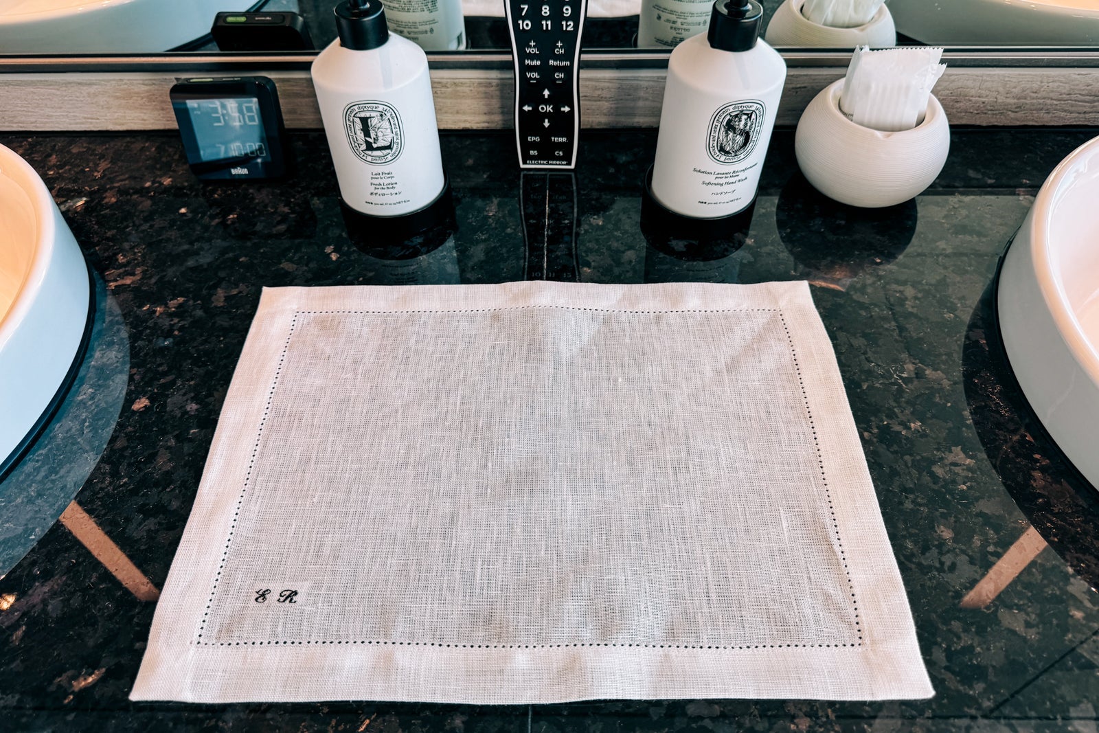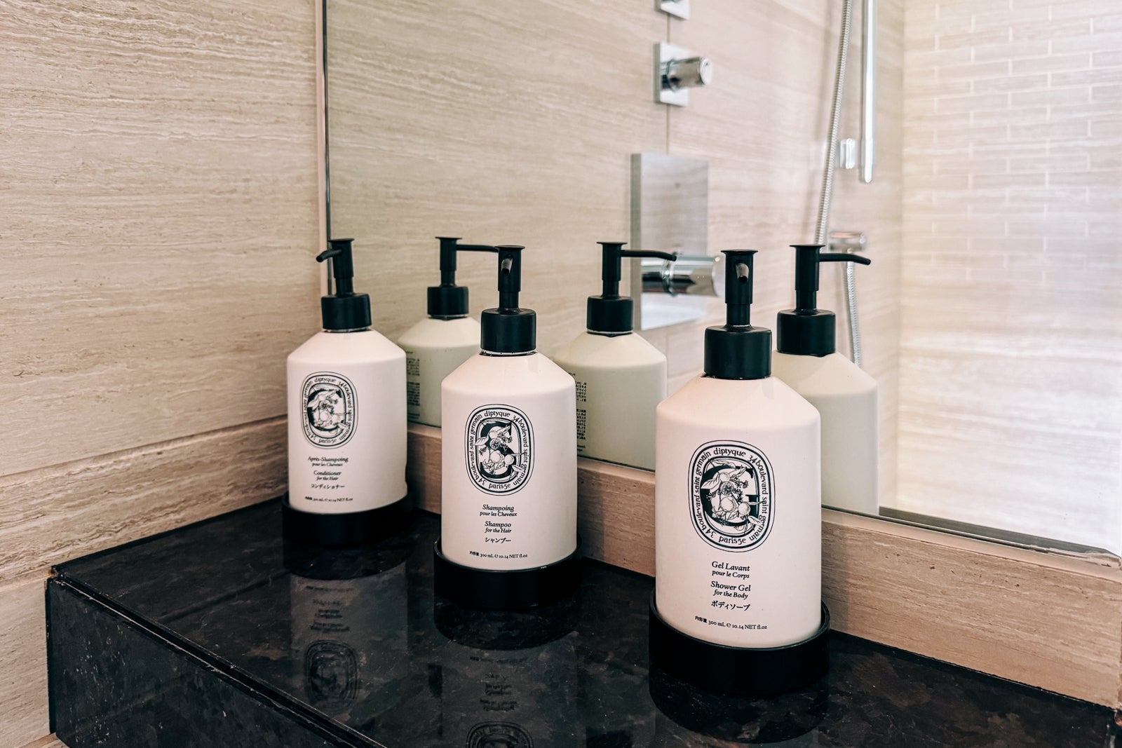 The bathroom had burnished black stone floors and counters, with walls clad in attractively striated gray limestone. Two sinks punctuated the room-length vanity counter, anchored along a mirrored wall, and were provisioned with Diptyque hand soap and lotion.
