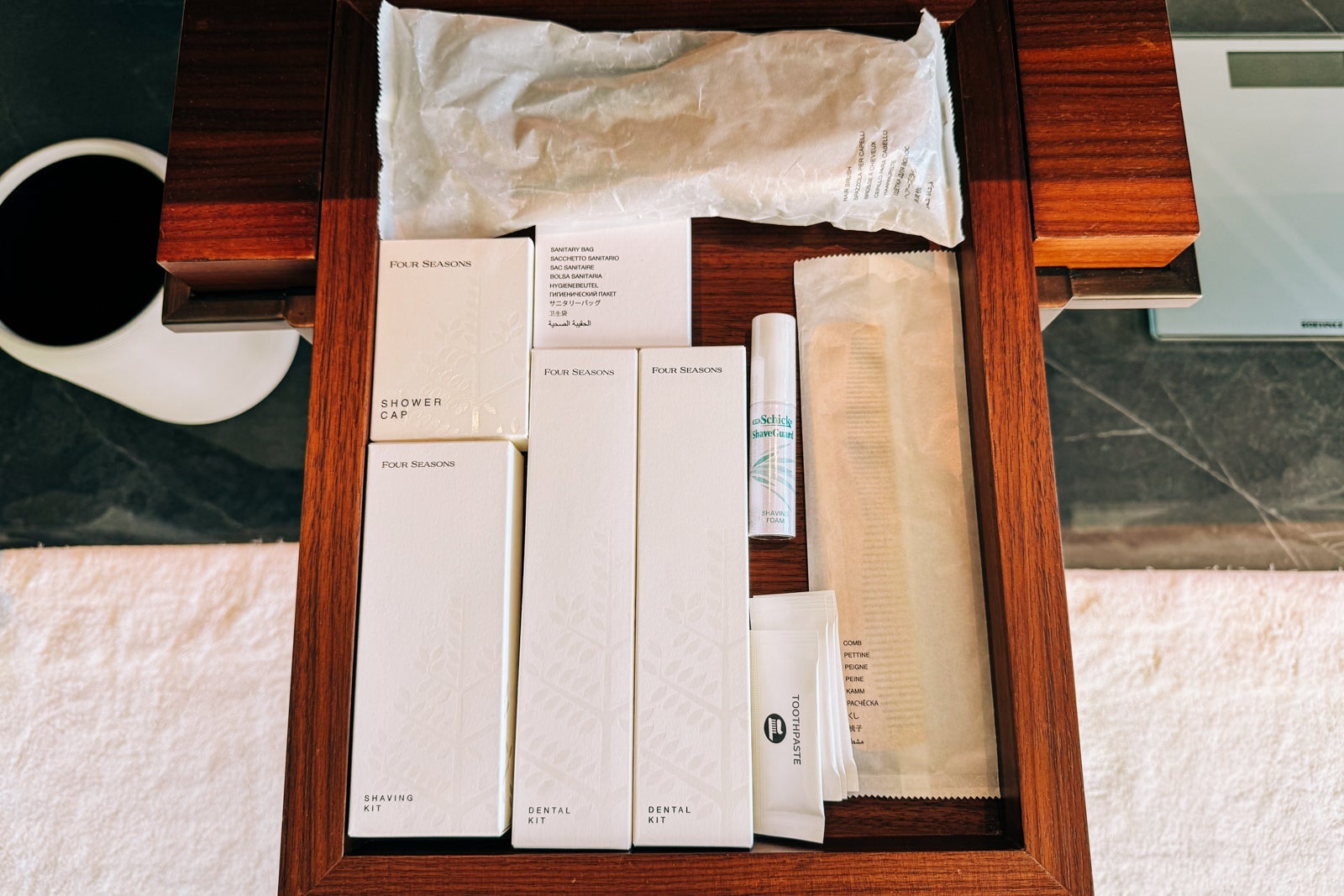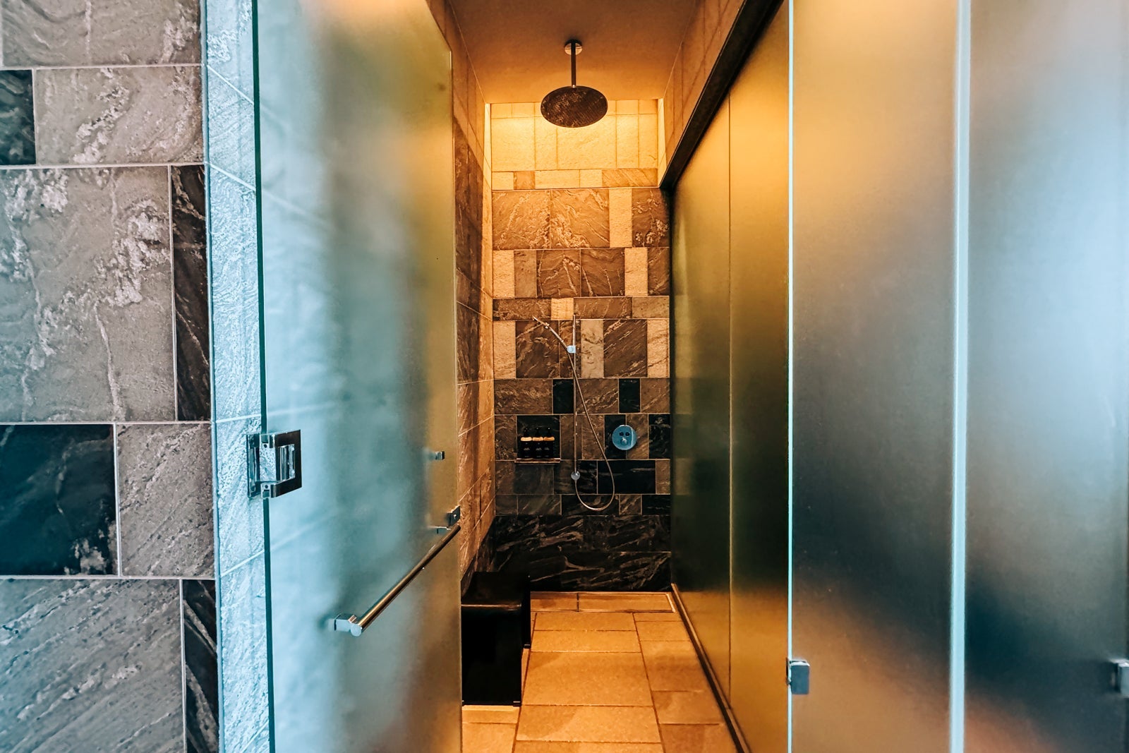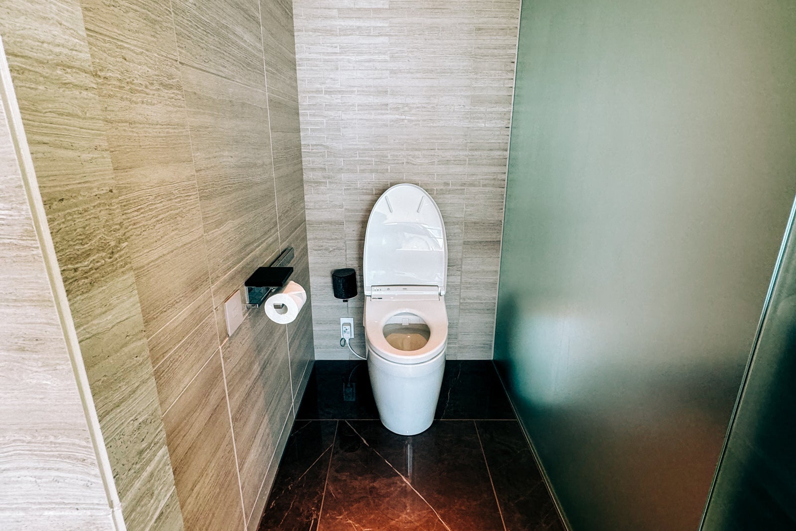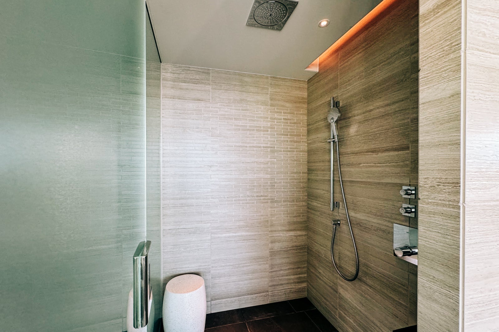 There were also Diptyque products waiting in the walk-in shower, which had both an overhead and a wall-mounted handheld showerhead. The separate water closet held a Toto toilet with a panel of controls for various functions.