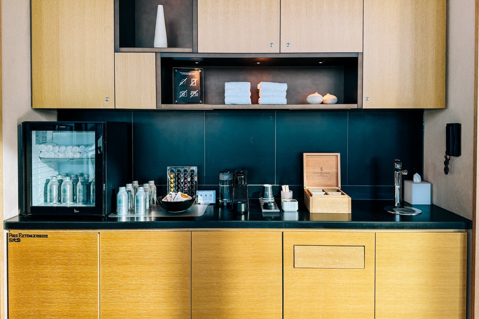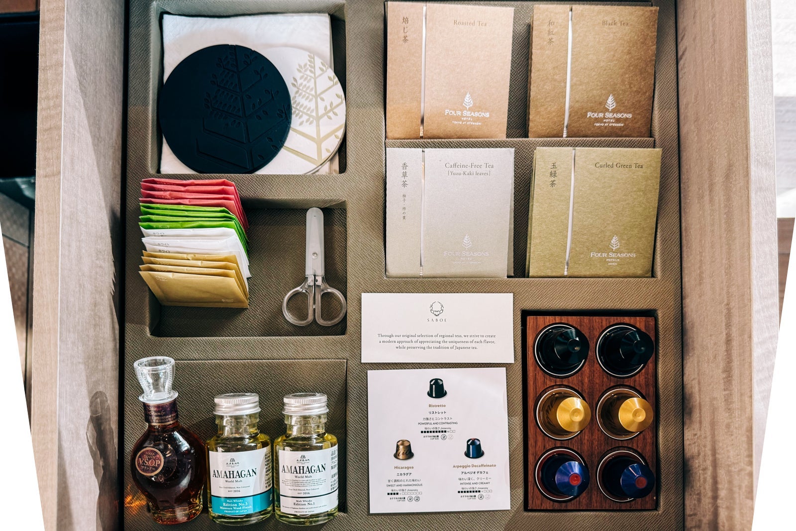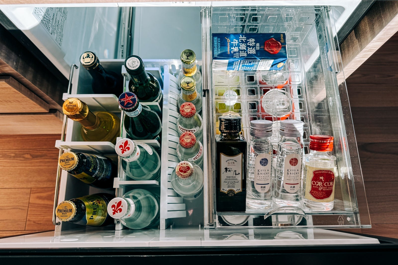 The minibar, meanwhile, held a selection of snacks like nuts spiced with black pepper and honey along with several Japanese-produced spirits, including Keys & Bricks vodka and Sakurao gin, a Nespresso coffee maker and kettle and Narumi bone china with which to enjoy hot beverages.
