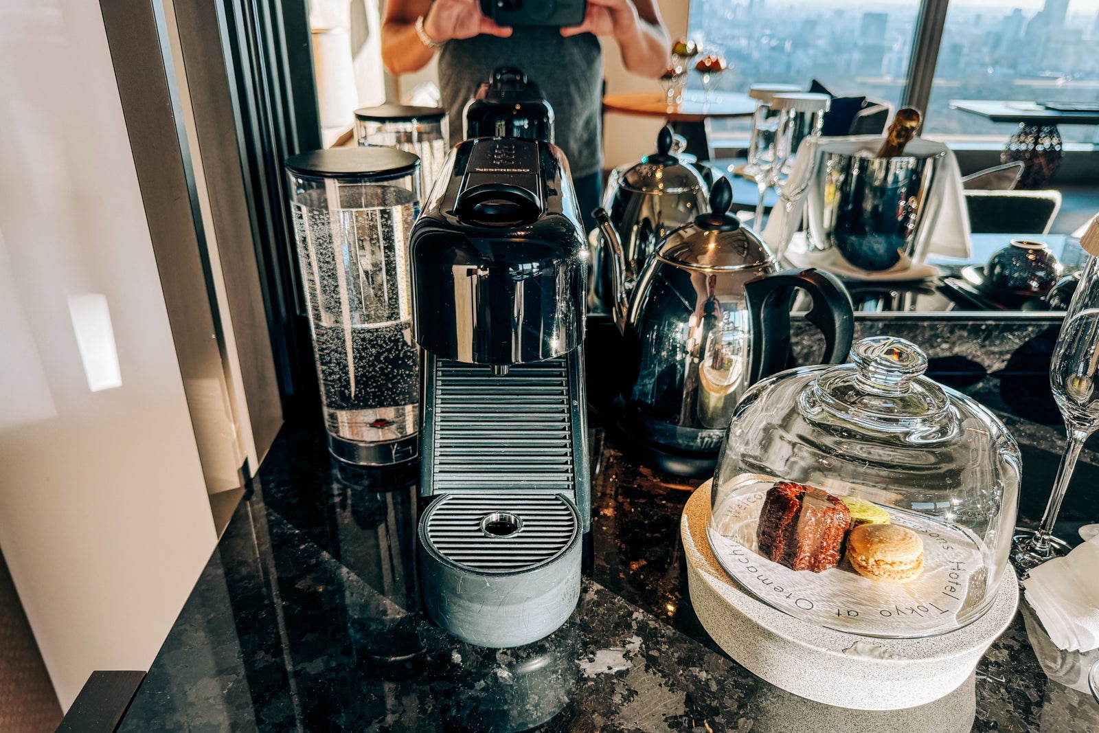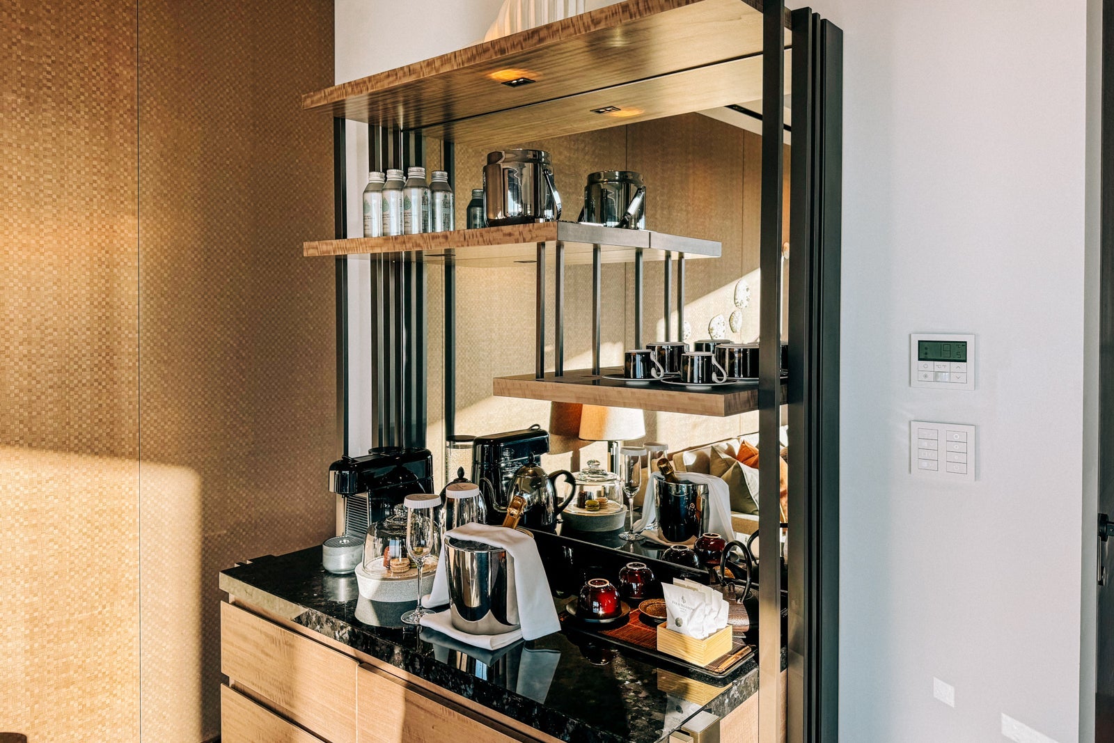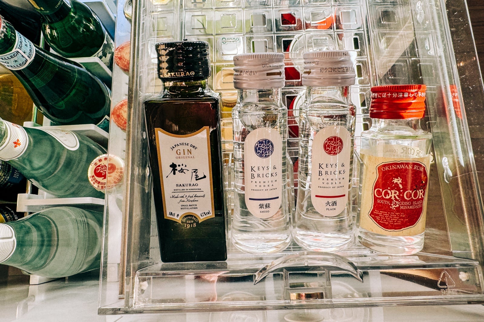 The minibar, meanwhile, held a selection of snacks like nuts spiced with black pepper and honey along with several Japanese-produced spirits, including Keys & Bricks vodka and Sakurao gin, a Nespresso coffee maker and kettle and Narumi bone china with which to enjoy hot beverages.