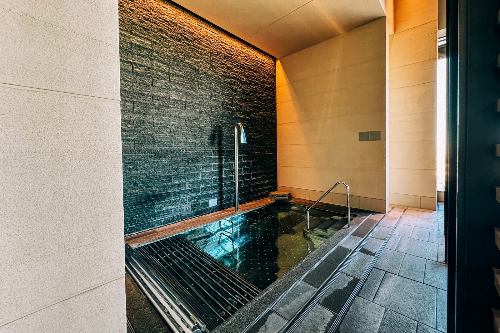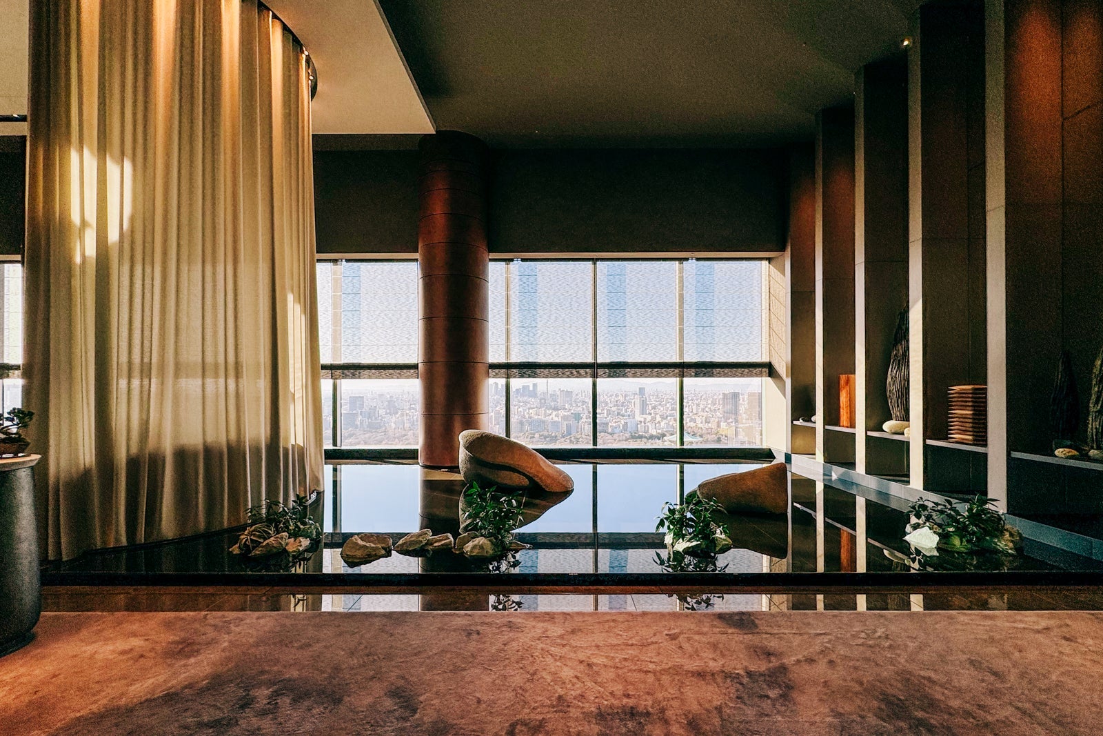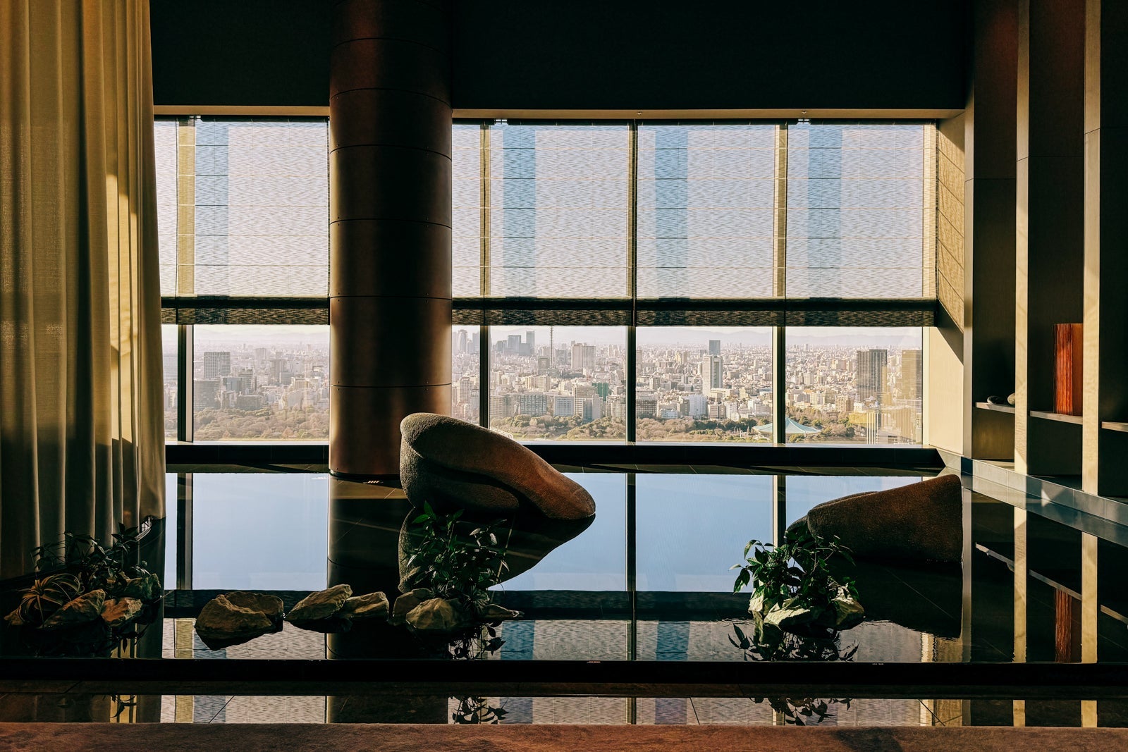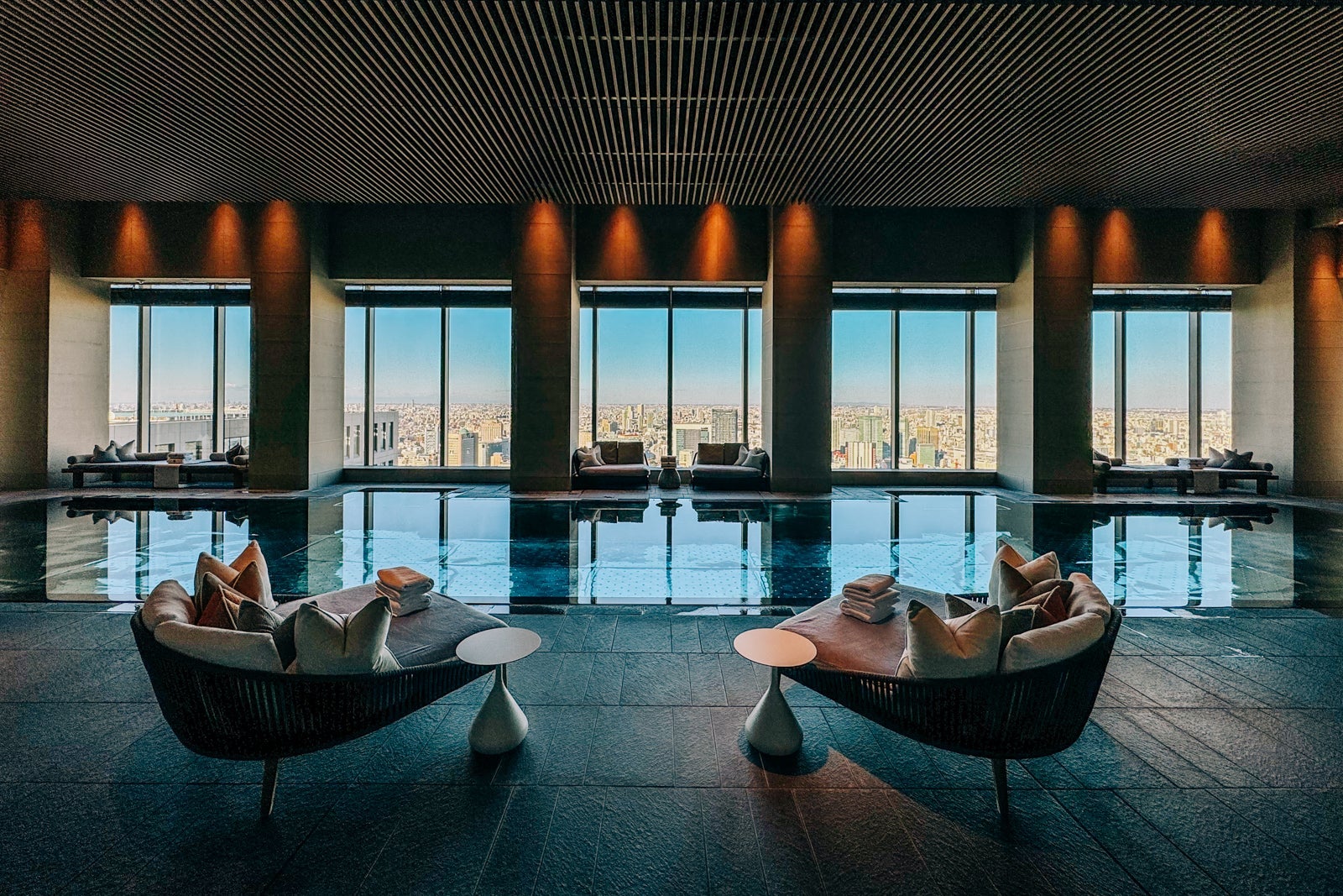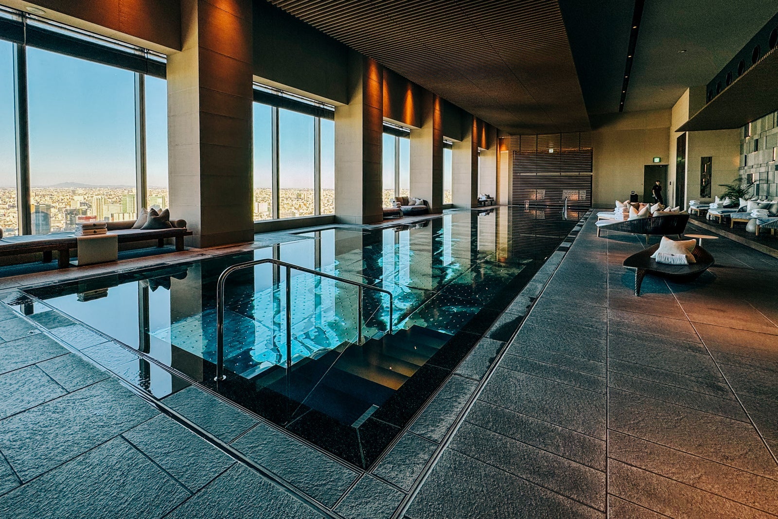 After, head to the locker room for a rinse in one of the shower suites, then don your bathing suit and grab one of the cushioned daybeds that surround the black-tiled pool with its reflective metal bottom as you contemplate the Tokyo skyline some more.