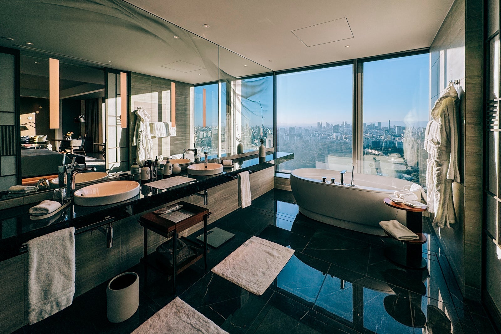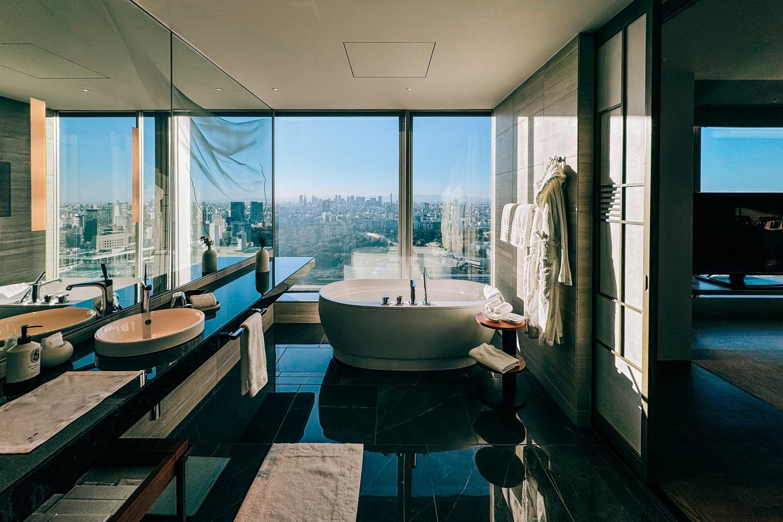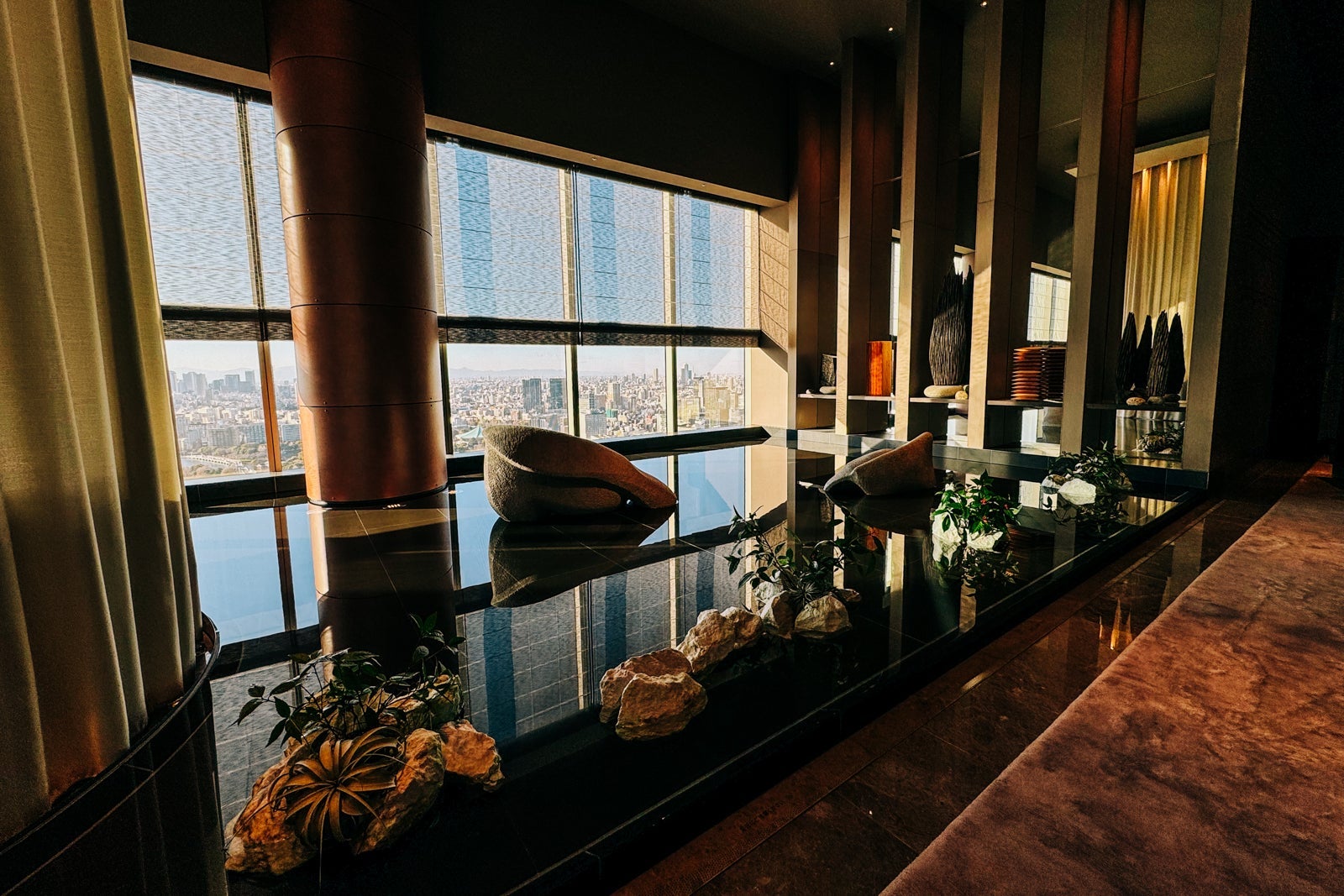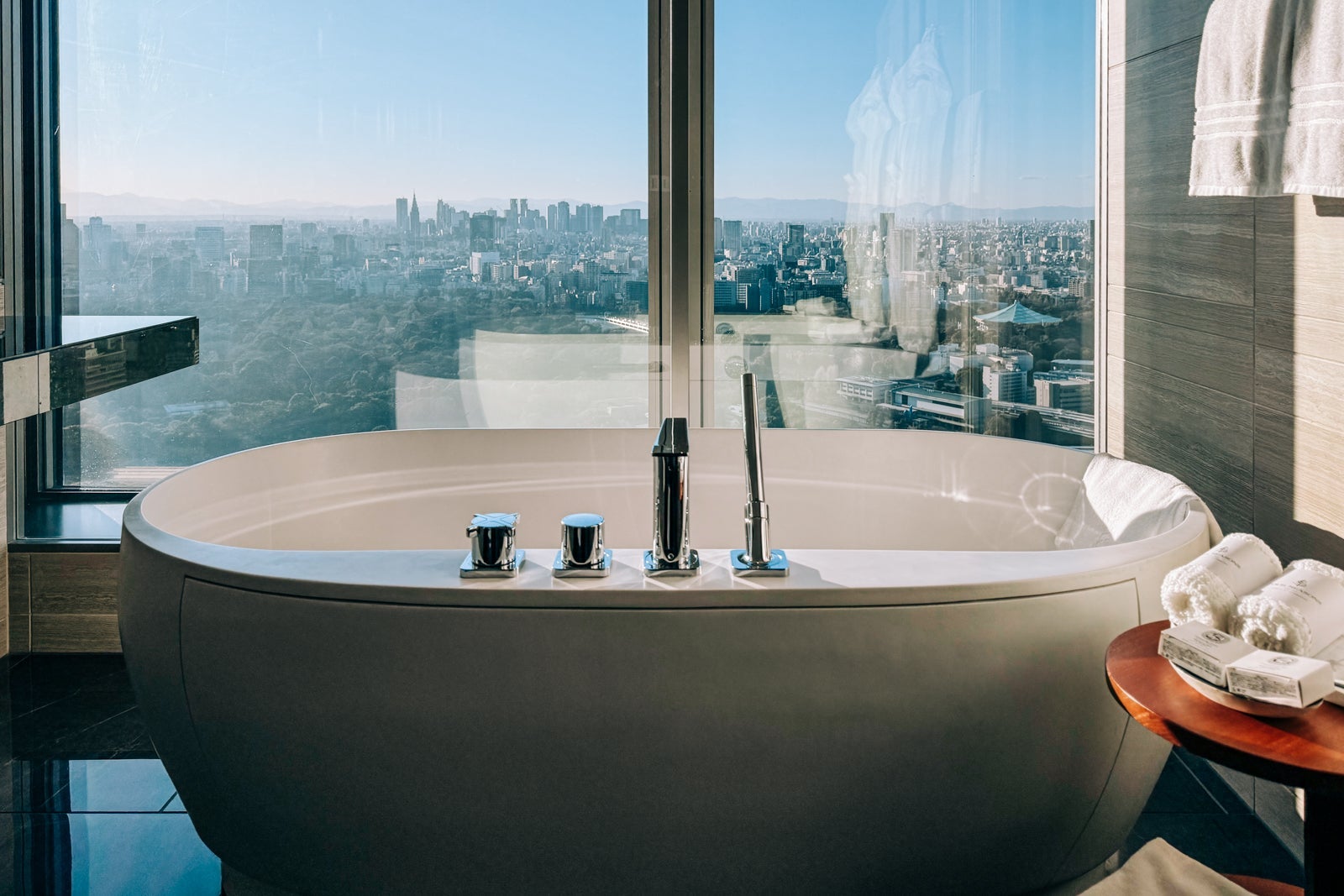 Of course, the panoramic views from its 39th-floor lobby, a swanky craft cocktail bar, a Michelin-starred contemporary Japanese-French restaurant and a serene spa — complete with onsen-style ofuros (soaking baths) — all lend to its allure as well.