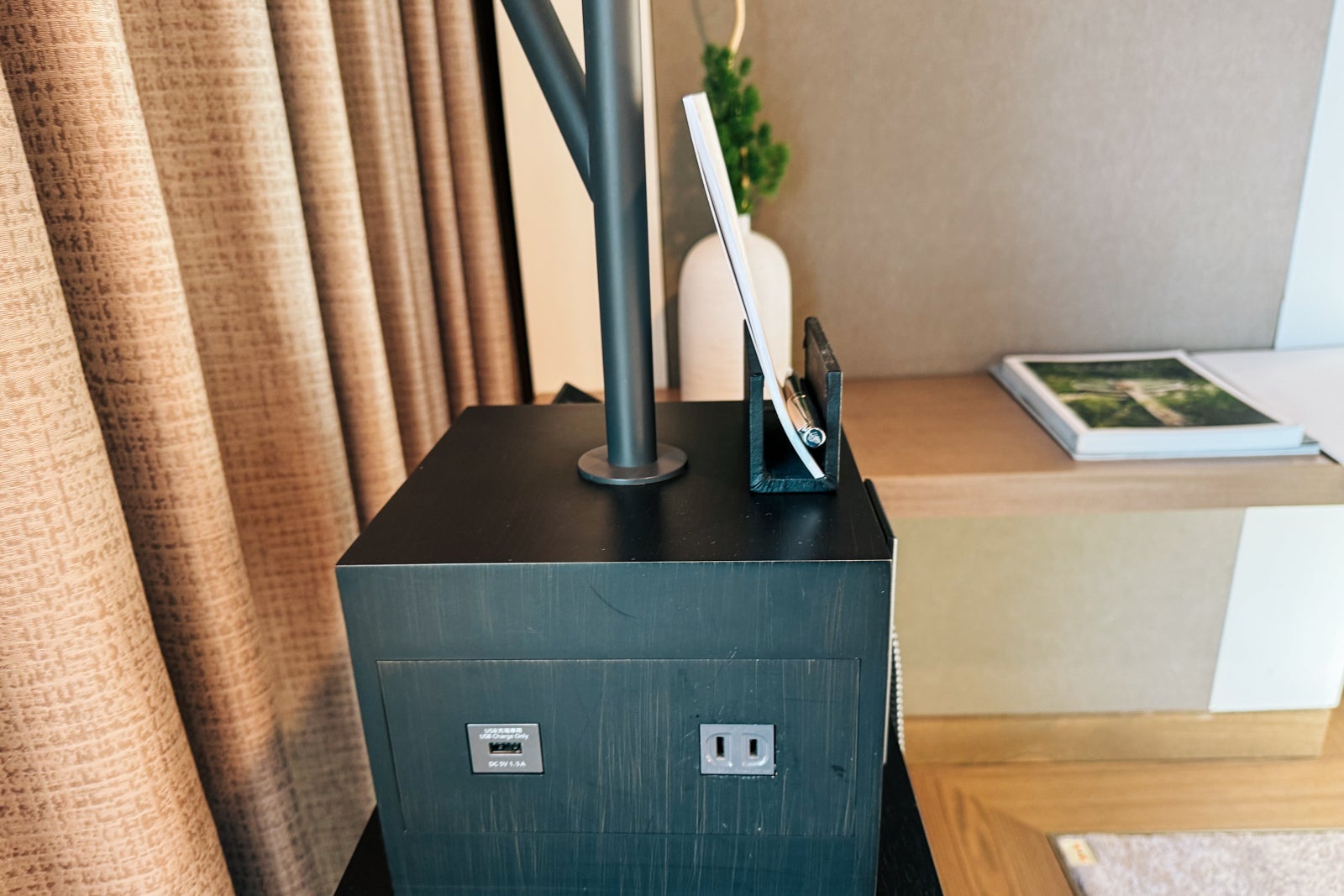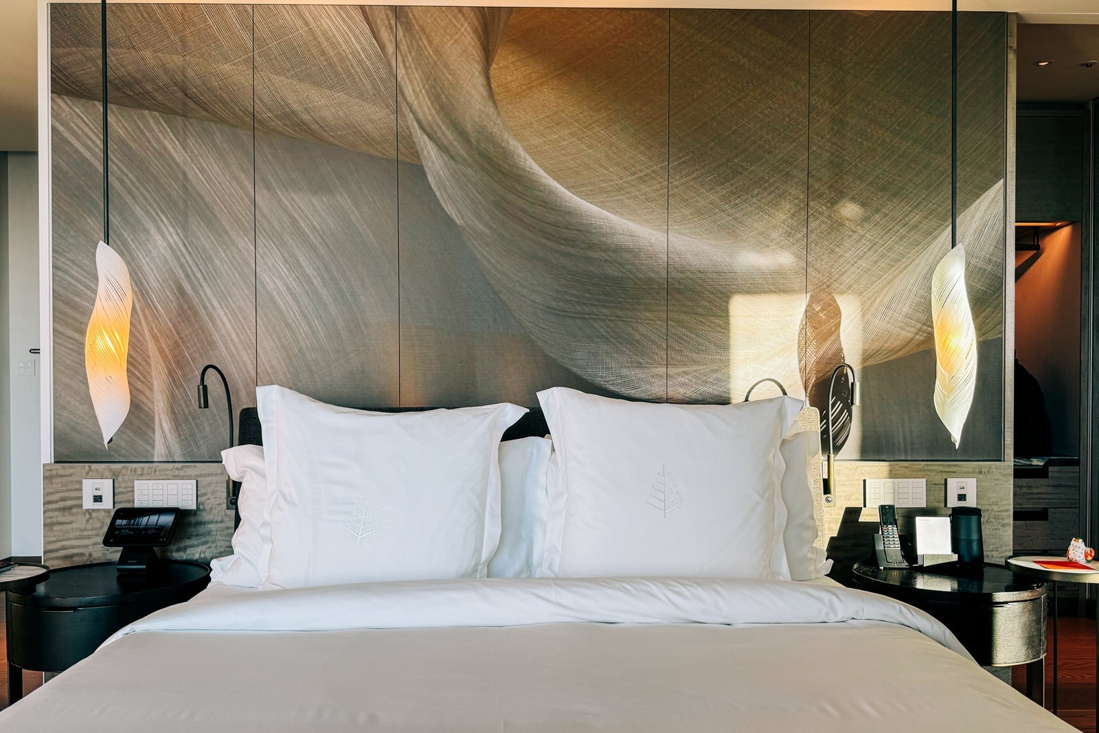 To either side was a panel of controls for the lights and curtains along with nightstands — a Bluetooth speaker and the phone on one side, and a tablet for taking advantage of the hotel's amenities on the other. The long, low table set against the windows held vases with flowers and a large flat-screen television.