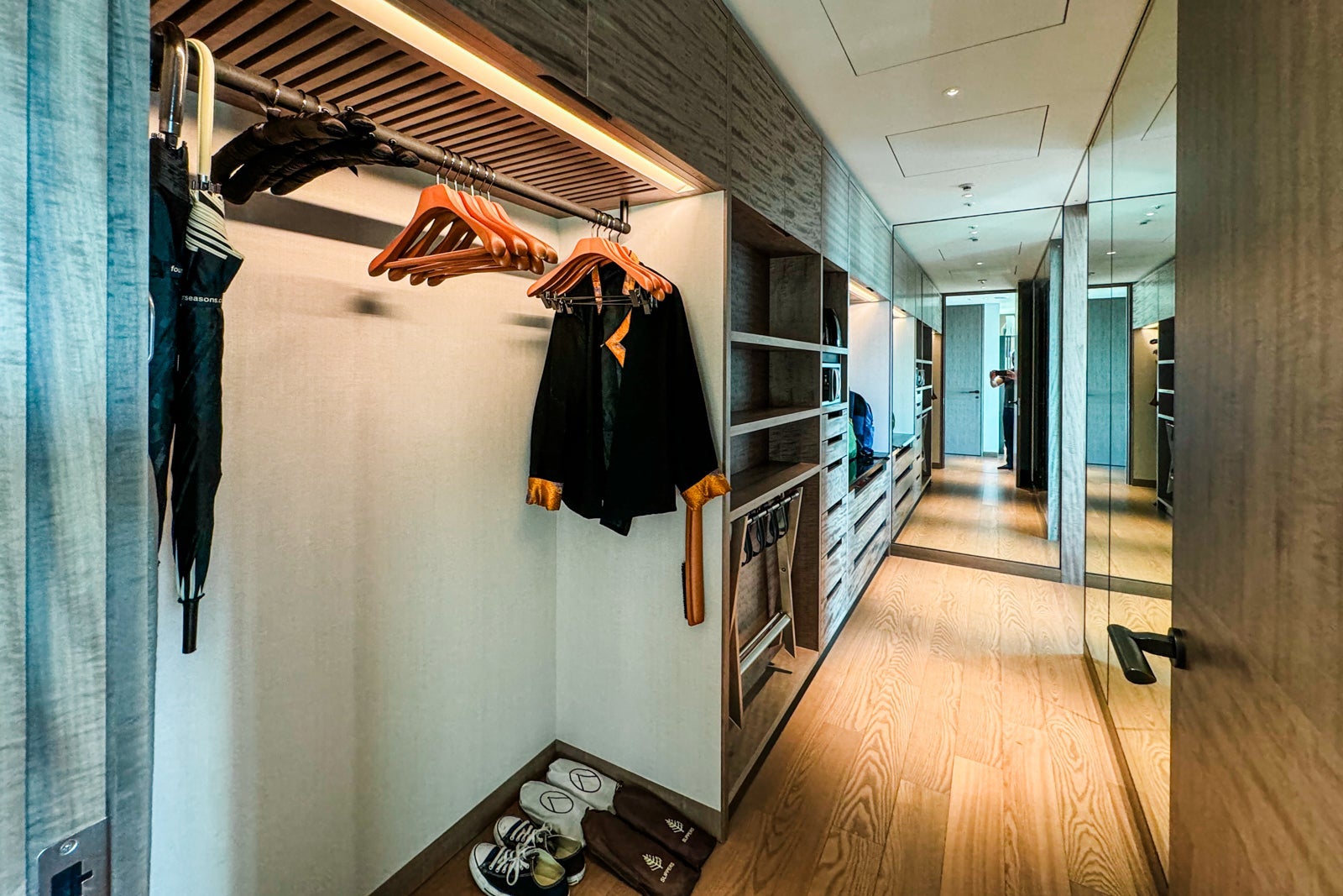 At over 800 square feet, there was a lot of ground to cover. To the right of the entry foyer was a powder room, while to the left was the enormous closet with space for luggage, hanging clothes and plenty of drawers, along with the safe.