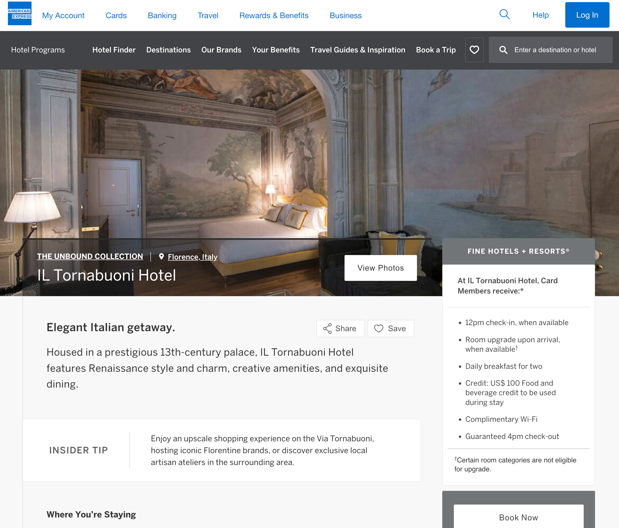 Il Tornabuoni is an Amex Fine Hotels + Resorts property, so if you book a stay through the portal and pay in full using your Platinum Card® from American Expres, it would trigger the annual up to $200 in statement credit.