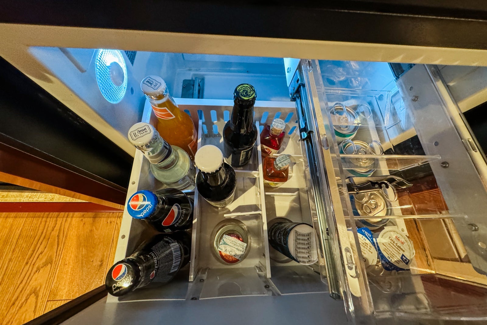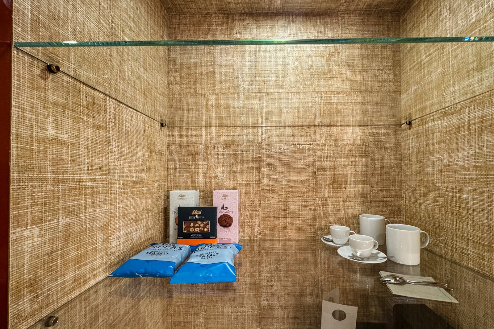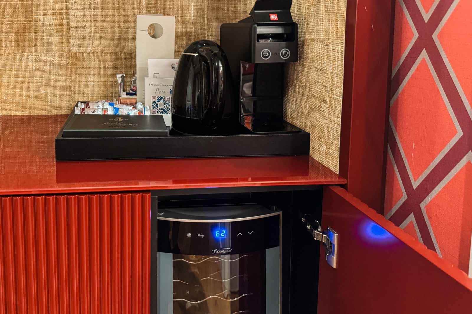 Our room also featured an espresso maker and coffee machine, a wine fridge, a minibar cold fridge and snack items. There was also an in-drawer safe above the minibar.