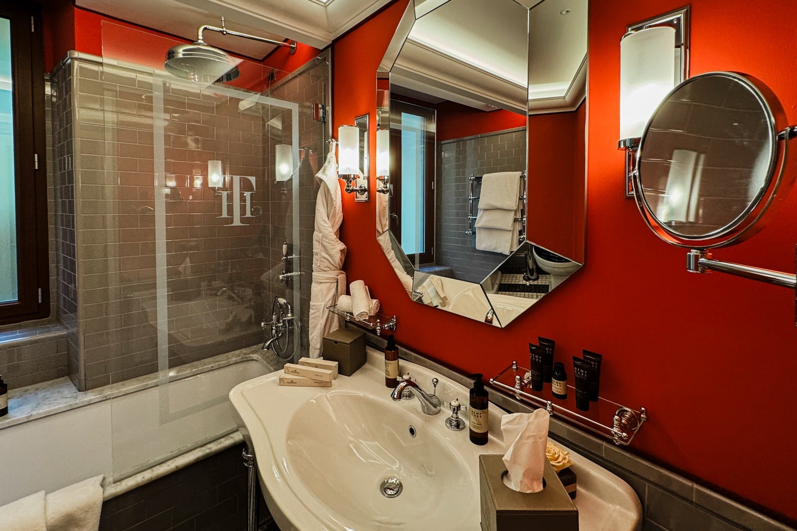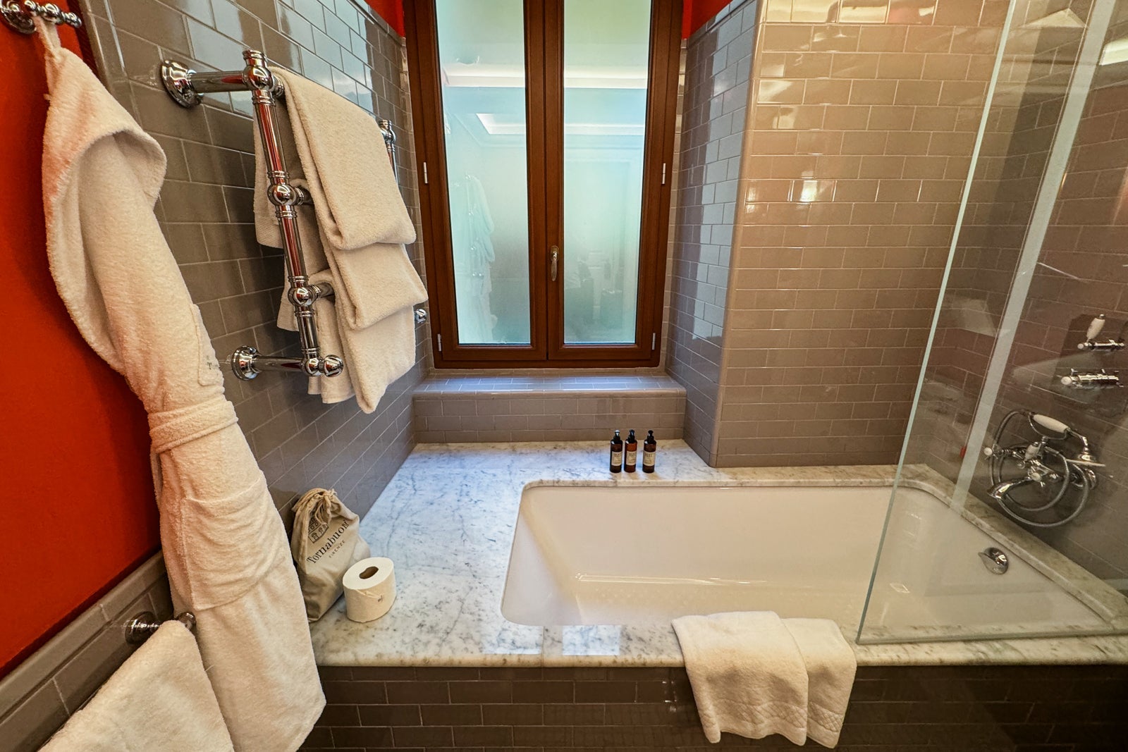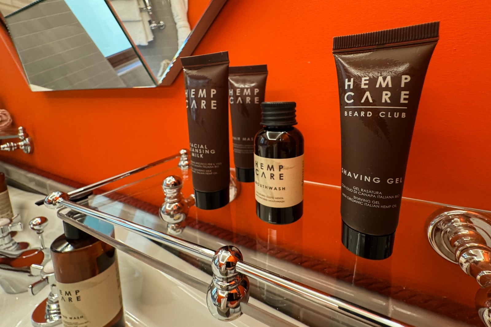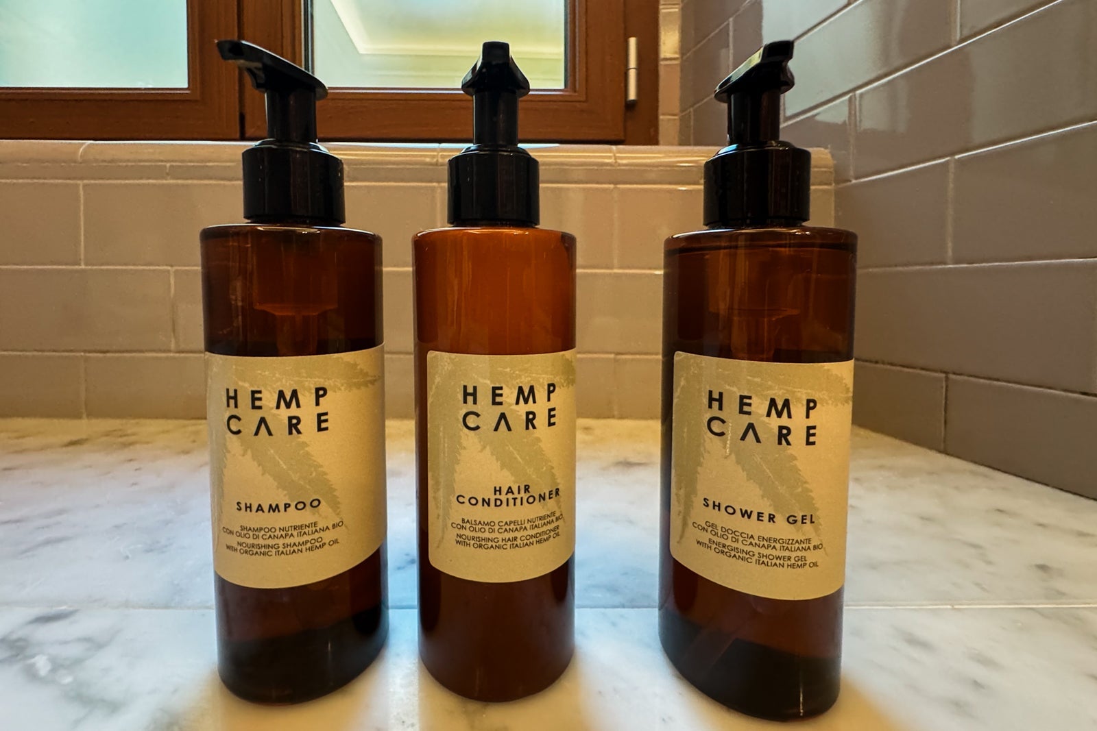 The bathroom in our room had a bathtub and a rain shower, as well as a hand shower function. Bathroom amenities from a brand called Hemp Care, which uses Italian hemp oil in its products, were plentiful. In addition to the basics, the room was also stocked with face wash, shaving gel and a hair mask.