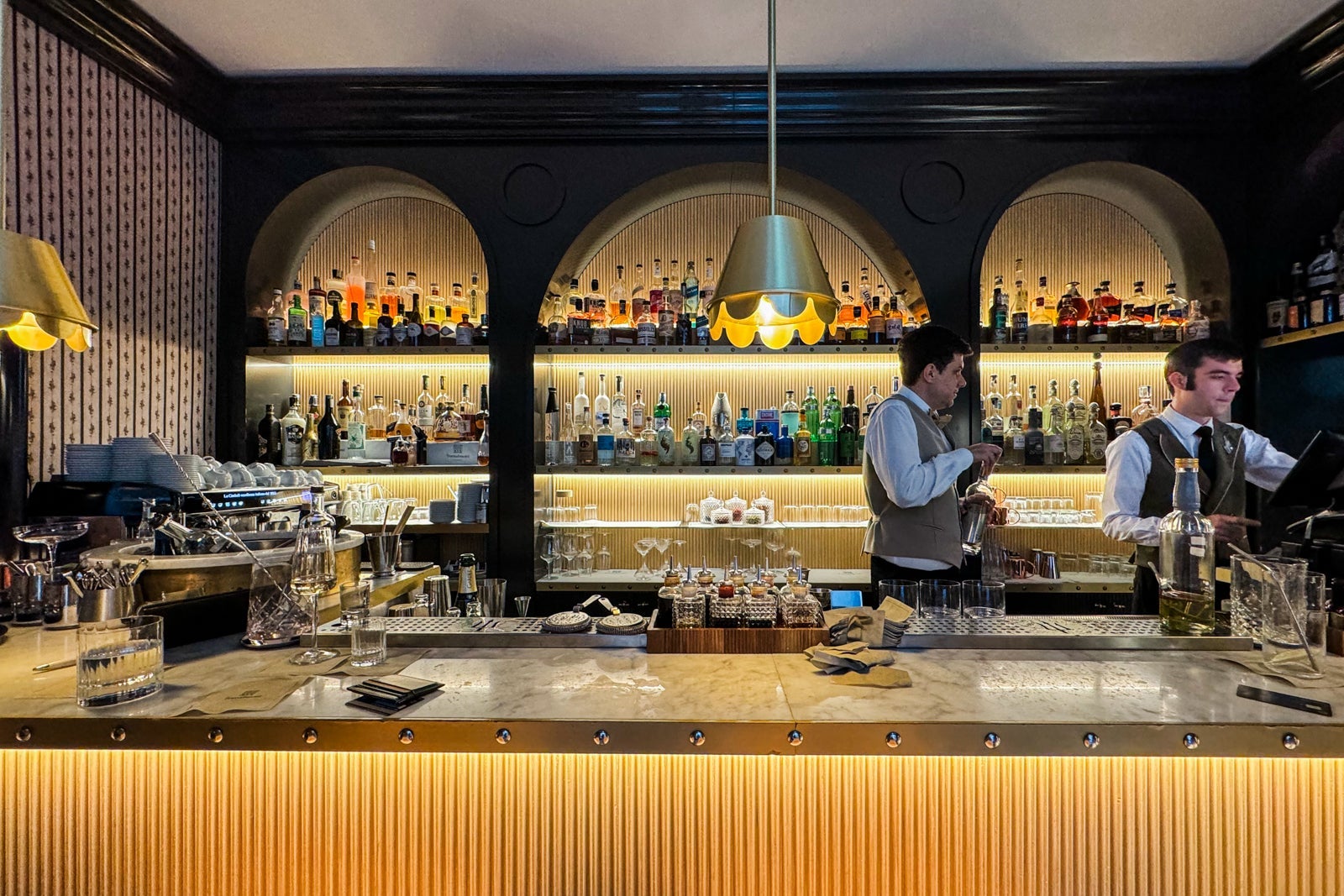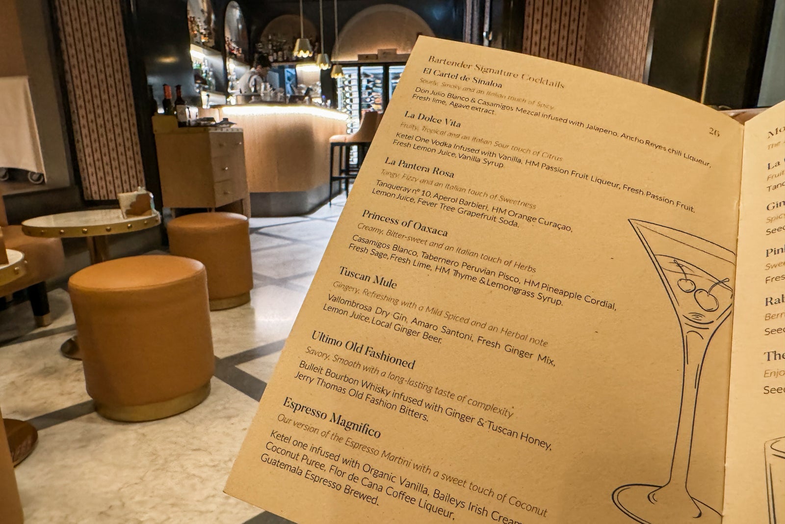 Spritzes and signature cocktails really shine at the glam bar, which stayed busy until closing. The house-made limoncello was one of our go-to orders. Drinks ran around $25 to $28 each. The menu also featured mocktails.