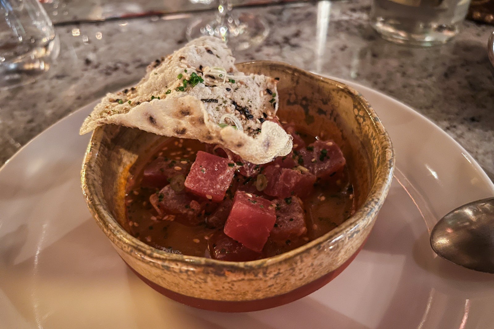 I paired it with the Atun Chifa, Coya's spicy take on ceviche. The tuna was incredibly fresh — the spice hit after, with a slow and subtle build — and served with a cracker featuring sesame seeds and seaweed. It took everything in my power not to drink the marinade after I finished the tuna. (Okay, I did drink some of the marinade, and I'm not sorry about it.) This was maybe the best ceviche I've ever had.