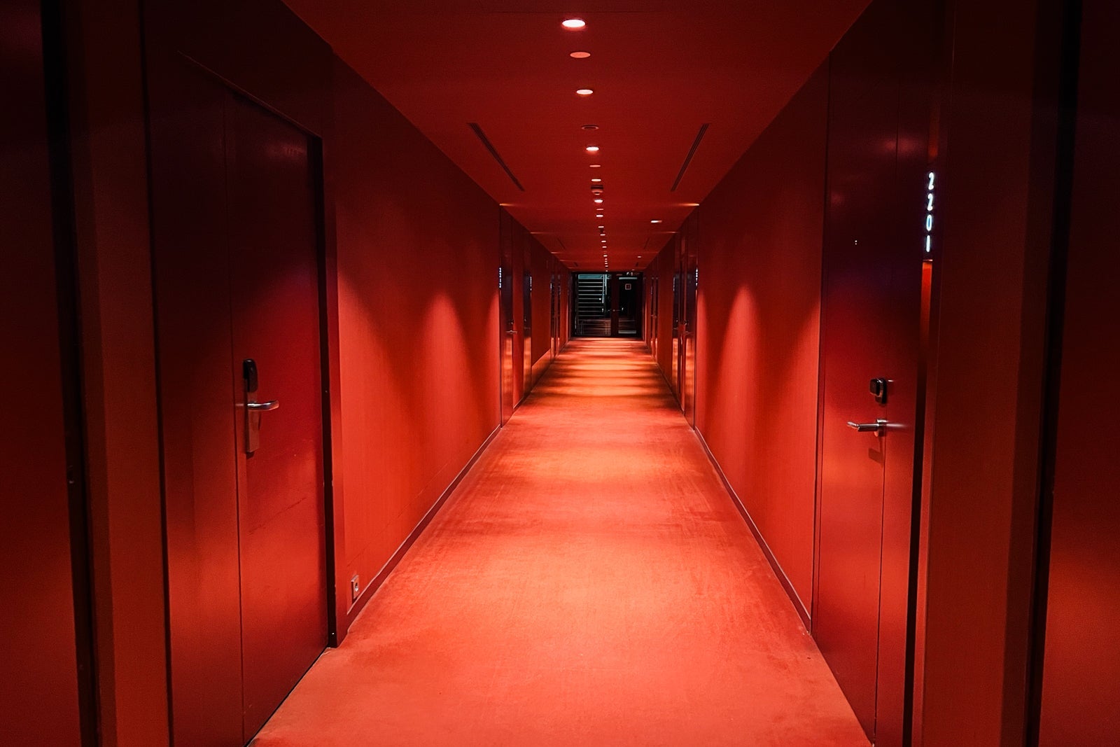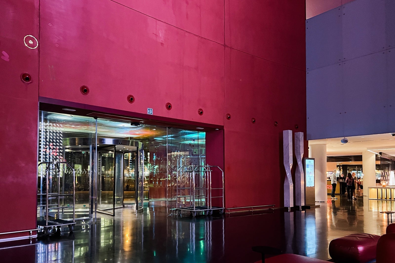 As I entered, I realized it was, first and foremost, a party hotel. From the shimmering silver tiled walls that lead your eye to the impressive glass ceiling, to the designated elevator that takes you straight to the rooftop nightclub, to the red walls and carpets lining the hallways, I felt like I had checked into a Miami-style "it" in the early aughts. Although the W Barcelona was built in 2009 and renovated in 2016, everything felt slightly dated, though not entirely worn.