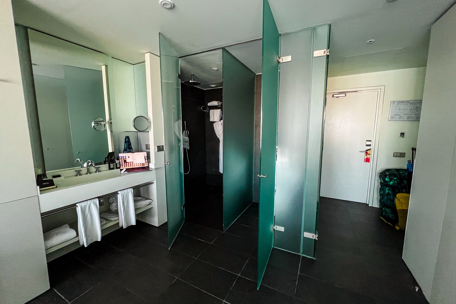 To the side of the room's entrance was a half-open-concept bathroom; the vanity and mirror were exposed to the room, and the toilet and shower were behind separate glass doors.