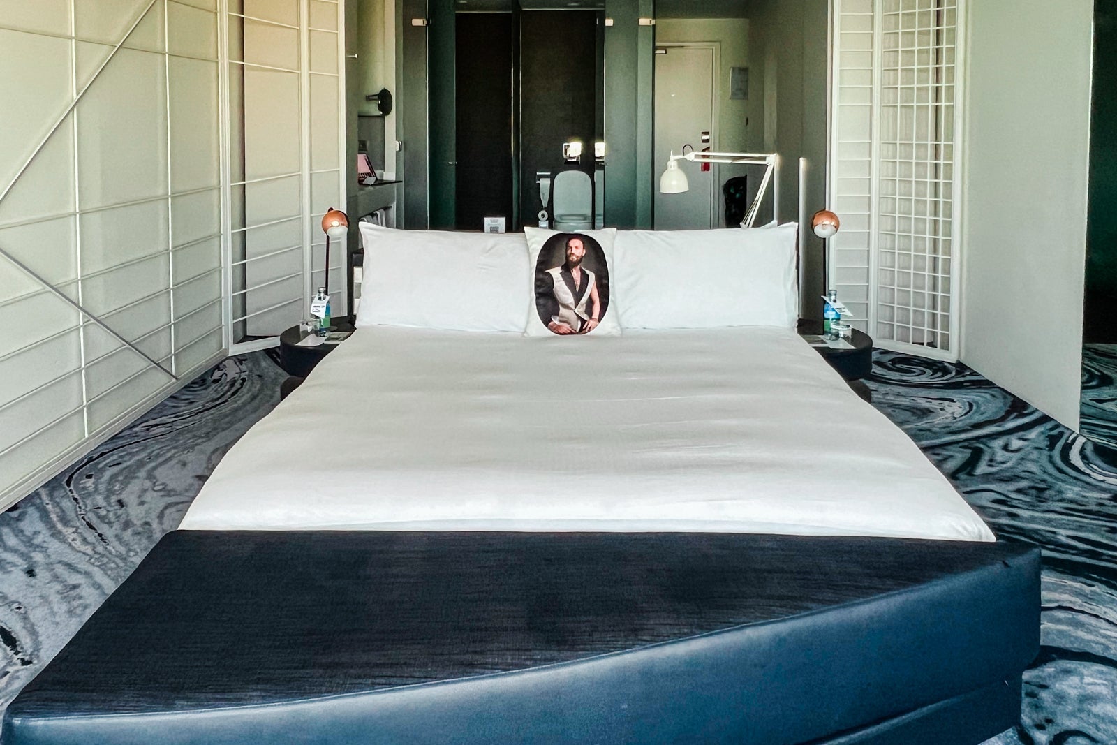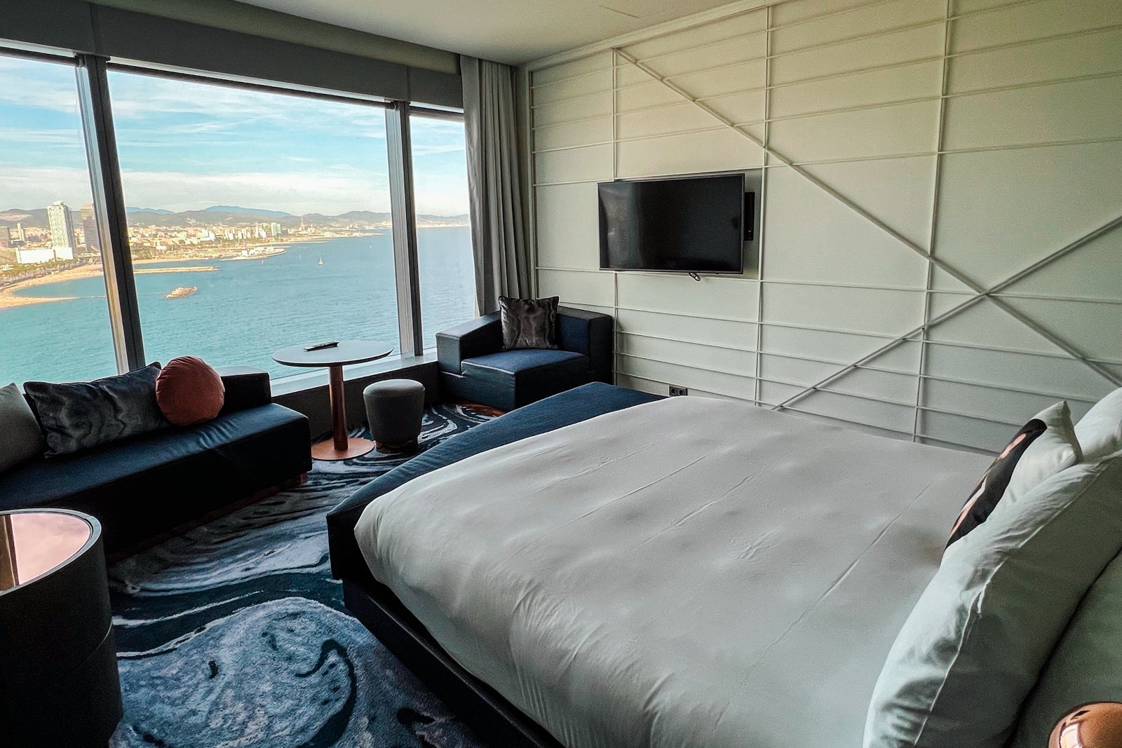 There were also many ocean-themed design elements, like the blue accent furniture and carpet that resembled waves. Against the windows were a loveseat and boxy armchair, plus a small side table. The white walls were decorated with a grid-like design and one featured a TV. The bed was comfortable, and I slept like a baby.