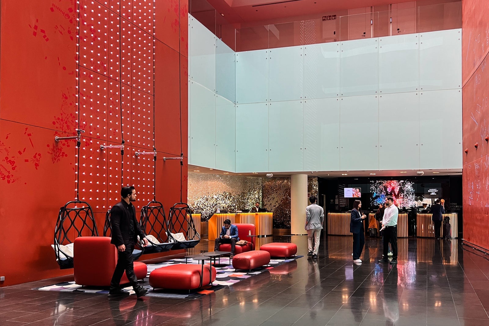 Check-in was easy and quick. There are six check-in desks, so though I arrived mid-afternoon — a busy time — my wait was maybe two minutes, maximum. If you need to wait in the lobby, there are fun seating options, including some hanging chairs.