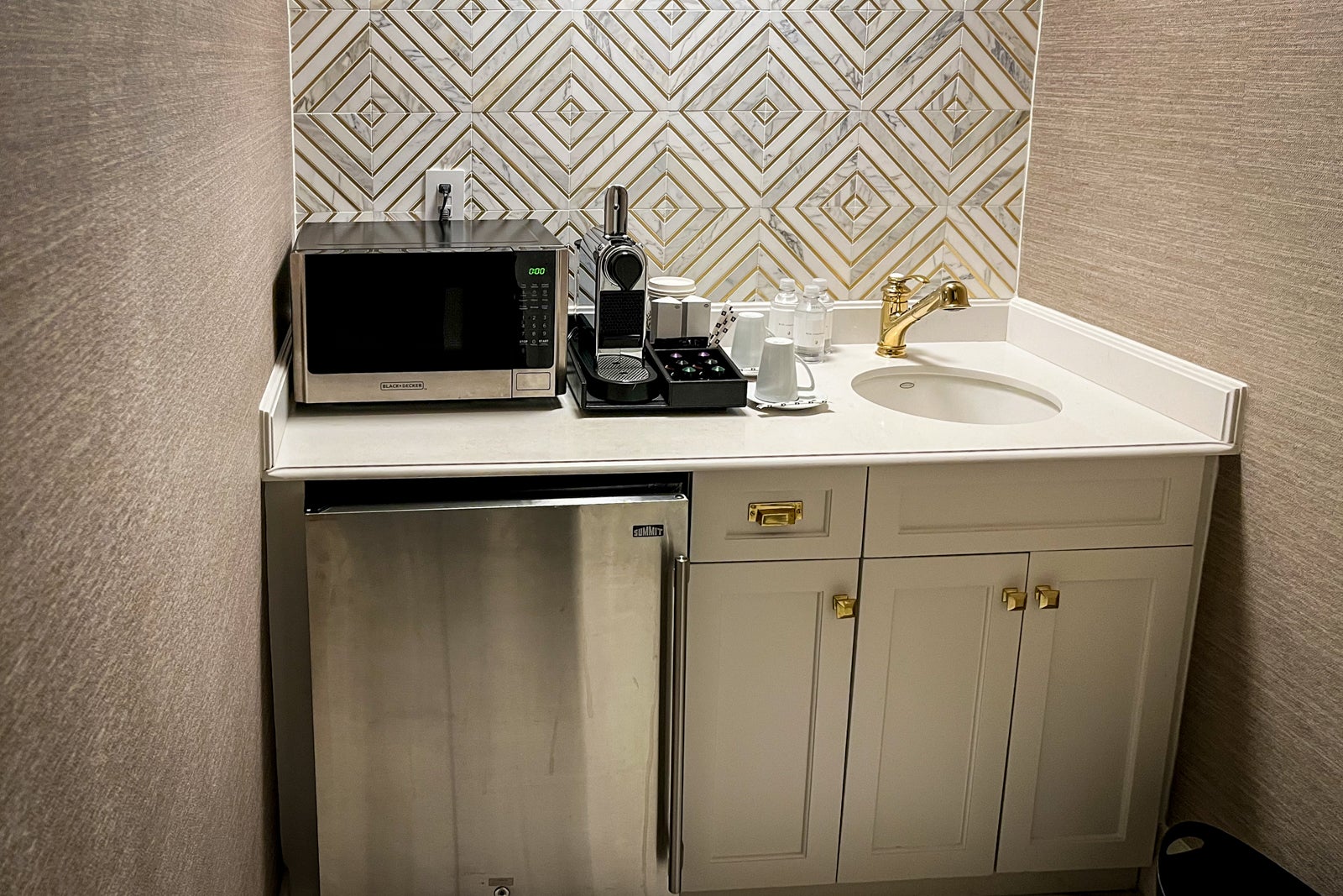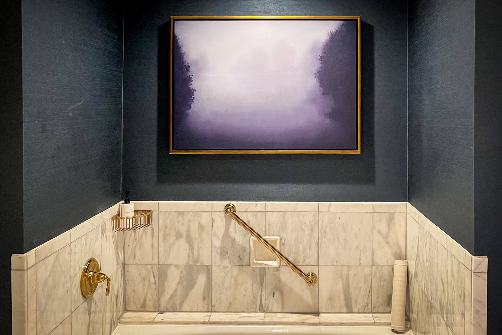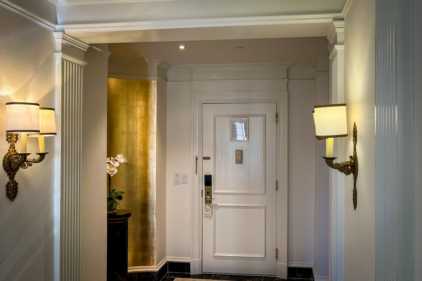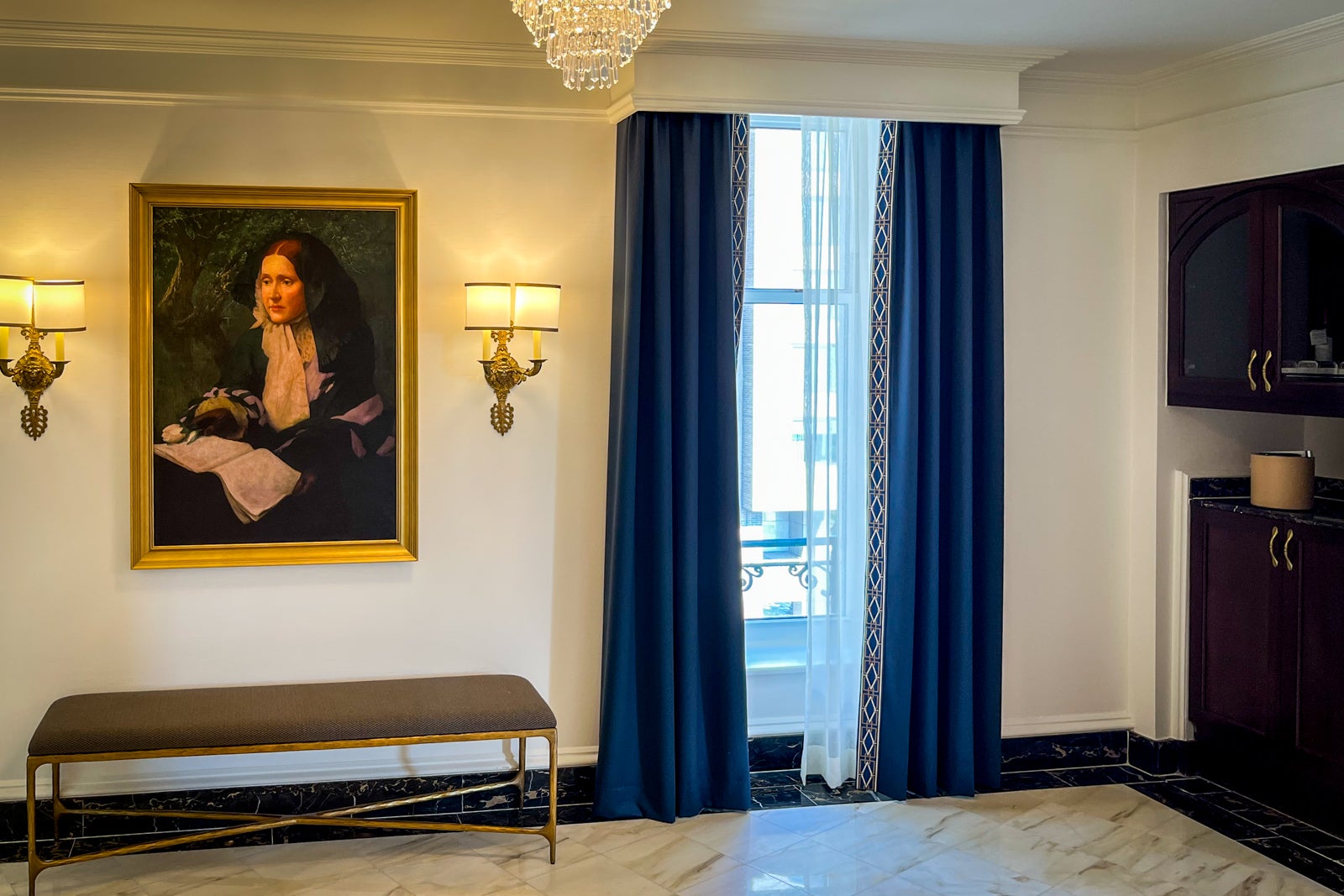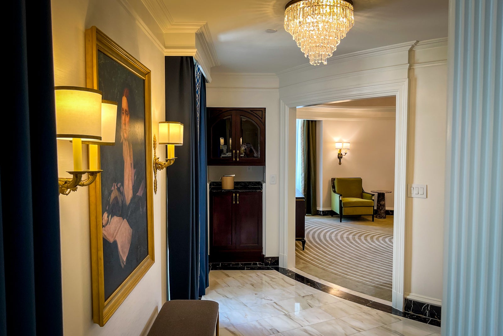 Upon entering the foyer from the main door, I was immediately drawn to the marble hall leading to a portrait of the suite's namesake before discovering a powder room and a butler's pantry with a minifridge, a Nespresso machine and a microwave immediately to the left. Walking toward the portrait, I was then faced with a choice: Turn left to go to the bedroom, or turn right to see the living area.