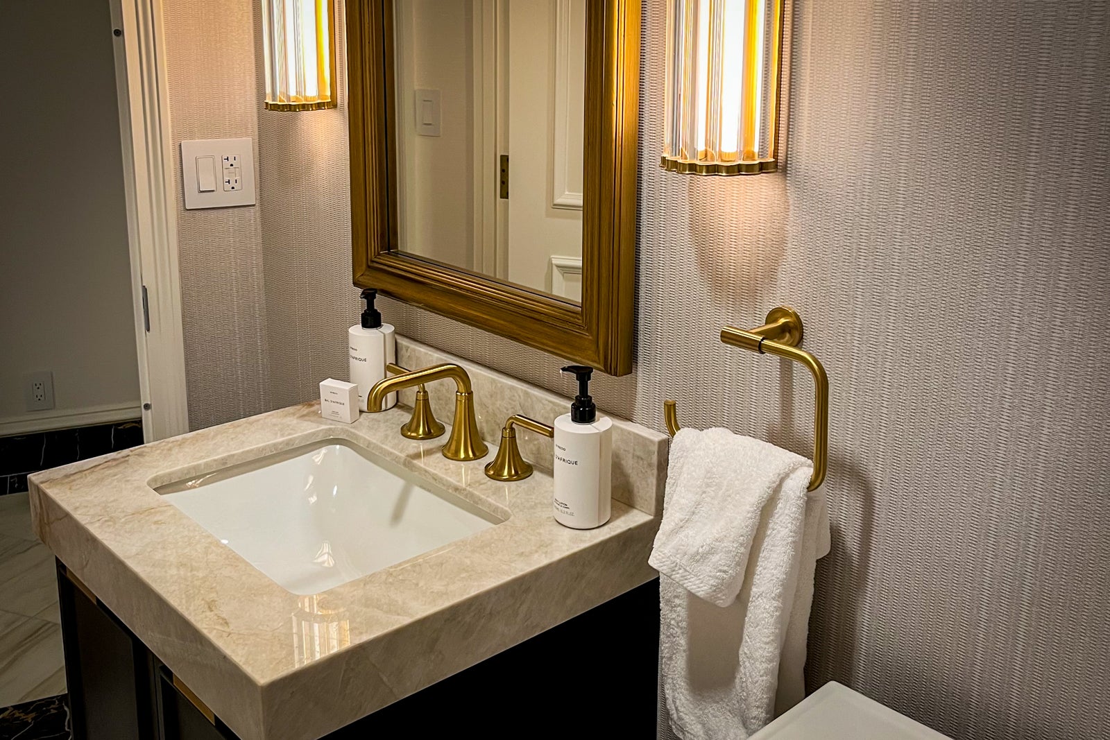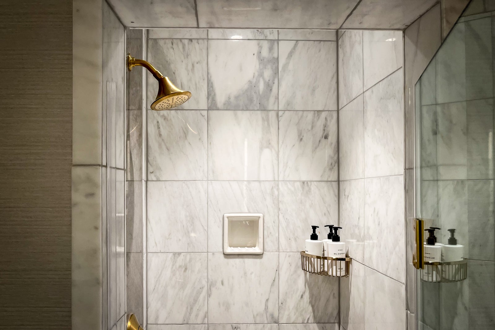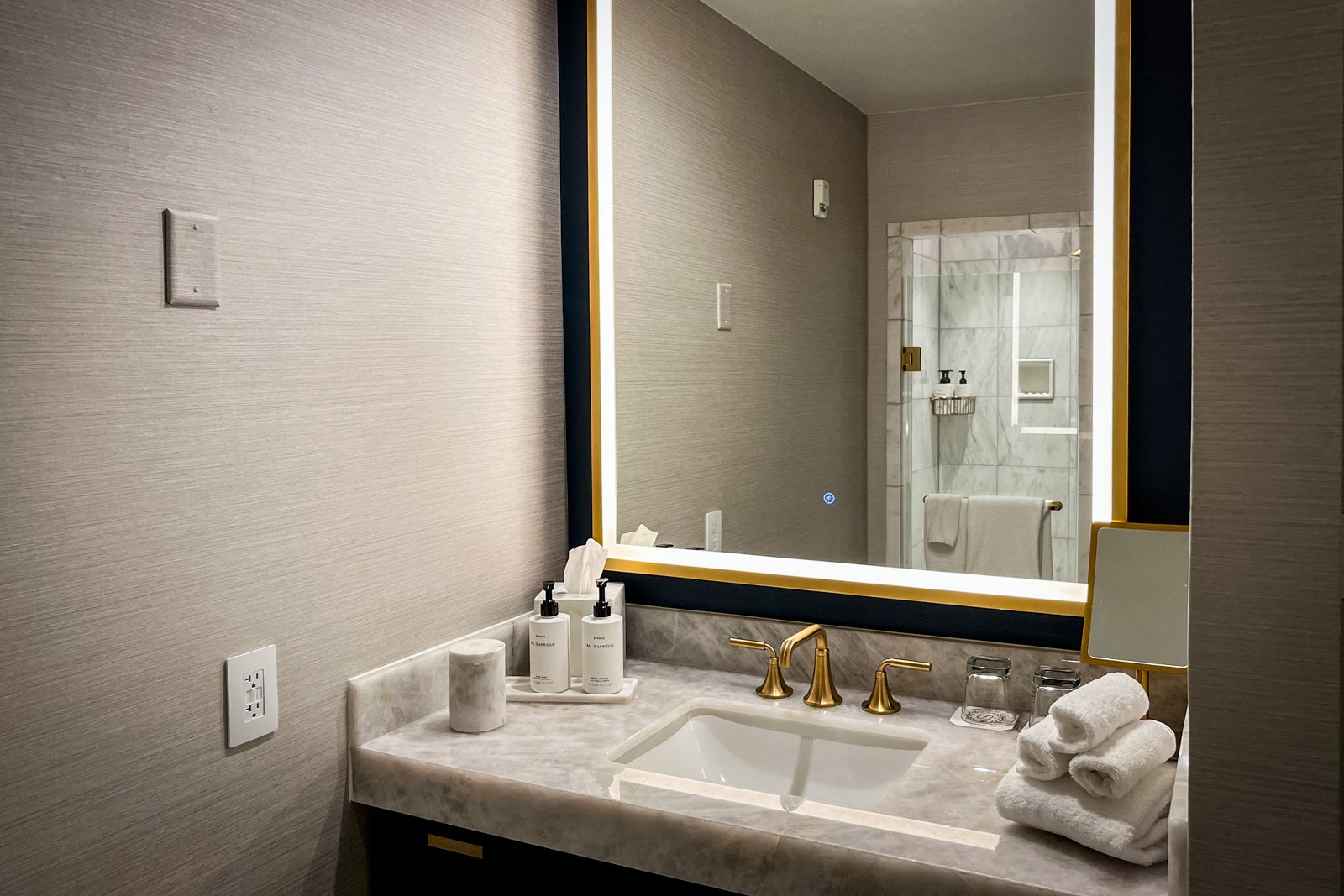 Just past the bedroom was another hall with a second closet leading to the second entrance and the main bathroom, which felt surprisingly small given the otherwise spacious feel of the suite, perhaps due to its lack of a second vanity. The bathroom was otherwise well appointed, though, offering a marble walk-in shower, a separate tub (also surrounded by marble), Byredo Bal d'Afrique bath amenities, a sink with a light-up mirror and — an unexpected find — a smart toilet.