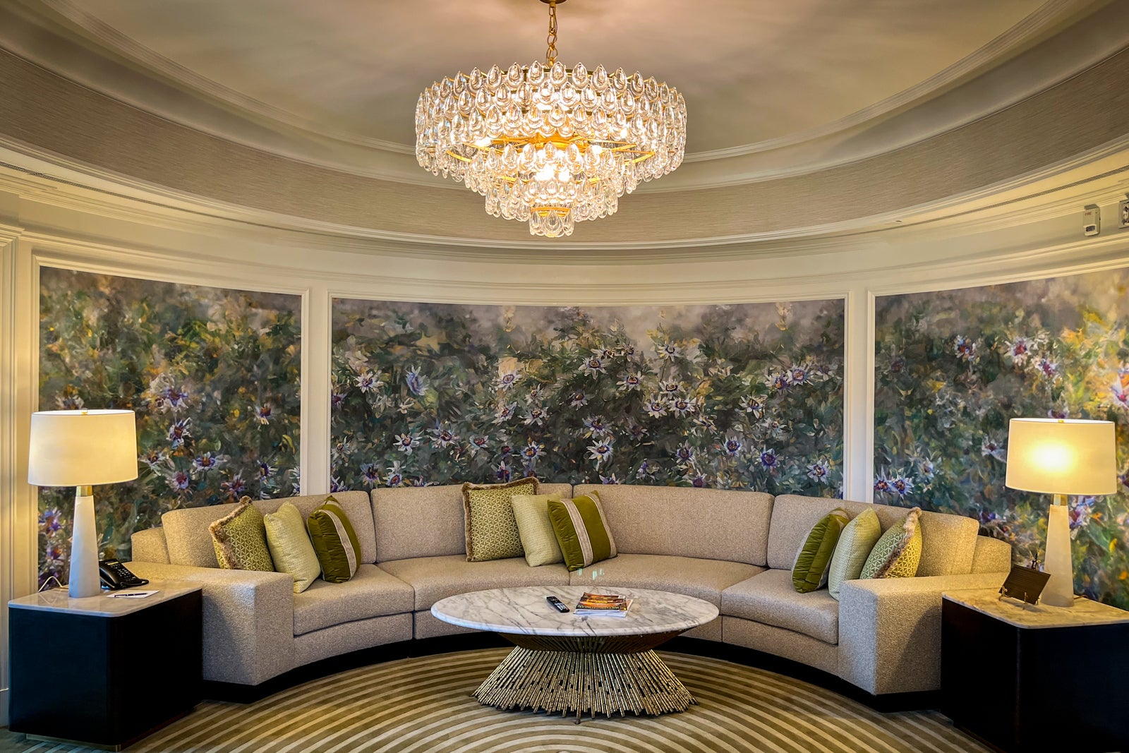 Turning back toward the foyer, just beyond the portrait of Howe, I discovered the highlight of the suite: a spectacular living room similar in shape to the famed Oval Office at the White House. I loved the custom curved sofa topped with pillows in various green hues and the beautiful mural inspired by Howe's "Passion-Flowers" book of poetry, as well as the cloudlike shadows depicted on the ceiling when the stunning chandelier illuminated the room. All together, they created a relaxing, inviting space ideal for lounging — or playing, as Bailey preferred.