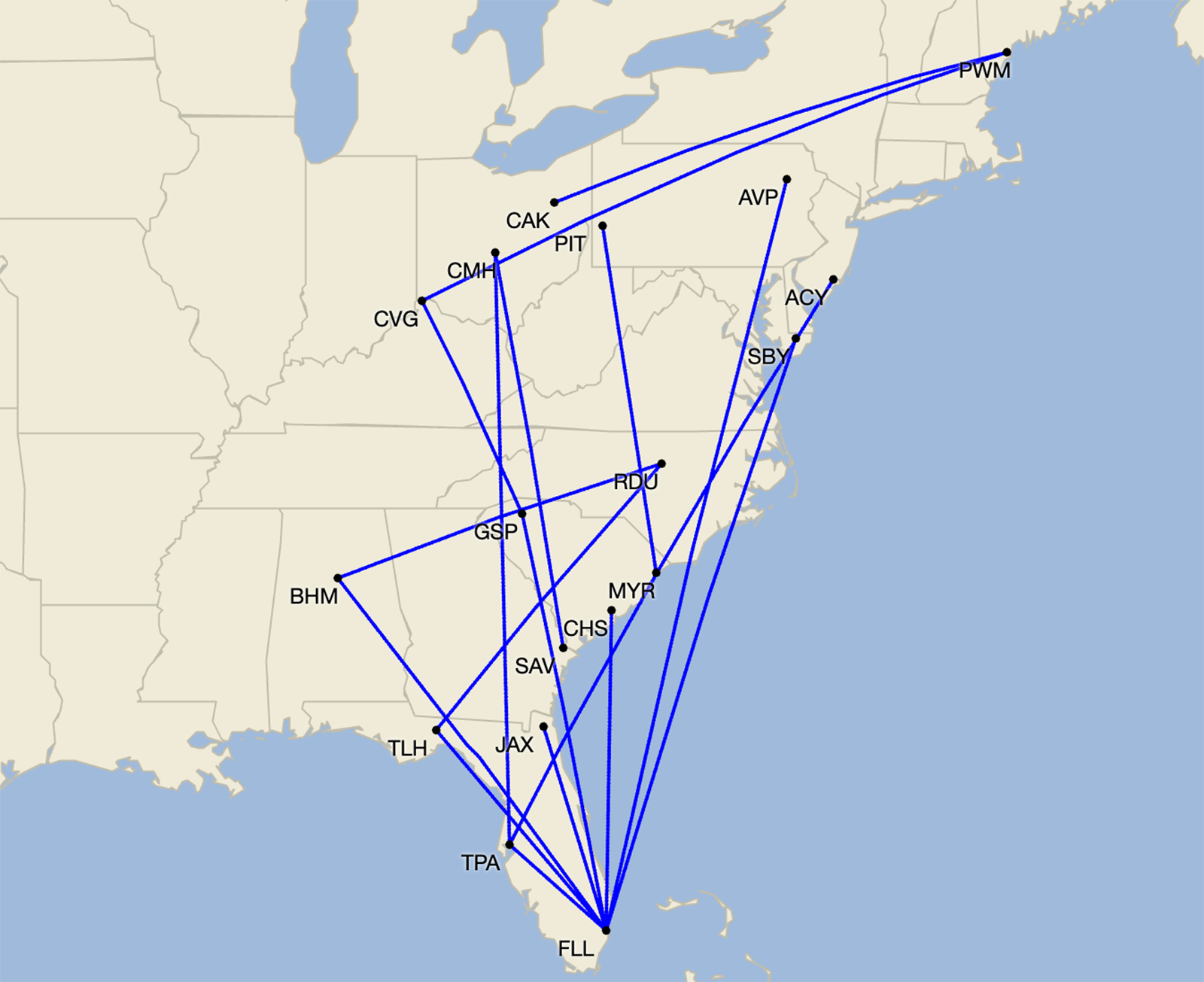 The airline faces other competition on five of its new routes: Allegiant Air on FLL-GSP and PIT-MYR, JetBlue on FLL-CHS and FLL-TPA, and Southwest Airlines on FLL-TPA, CMH-TPA and PIT-MYR.